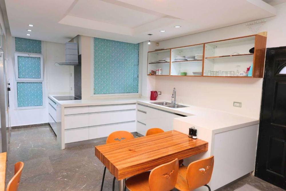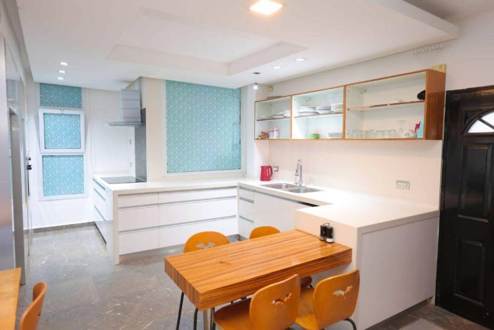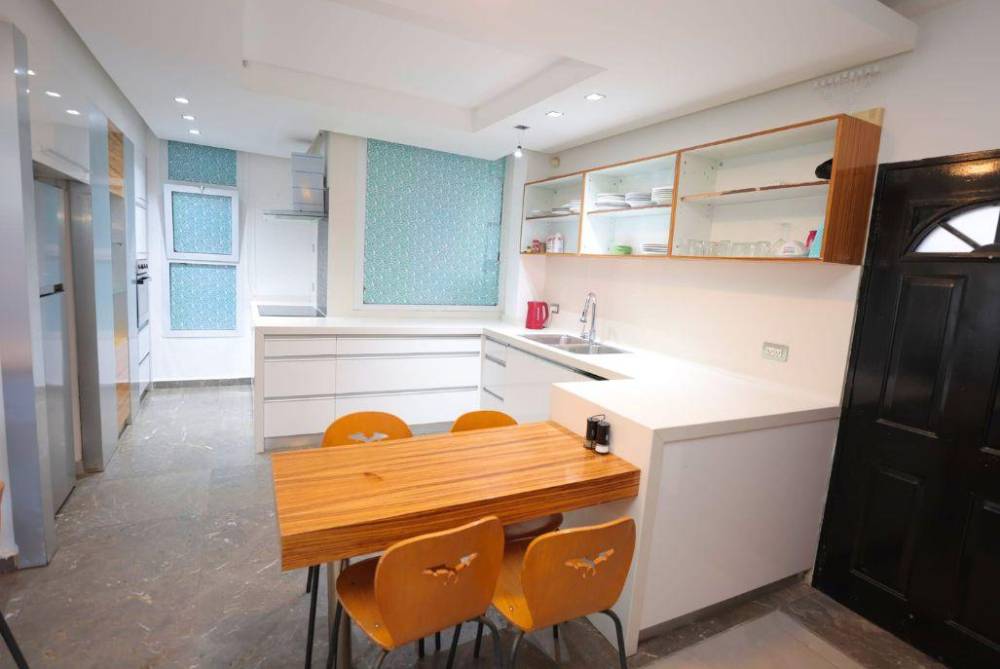 מטבח מאובזר קומפלט: קומקום חשמלי, תנור אפייה, מכונת אספרסו, מקרר, מכונת קרח, מדיח כלים, כיריים חשמליות,