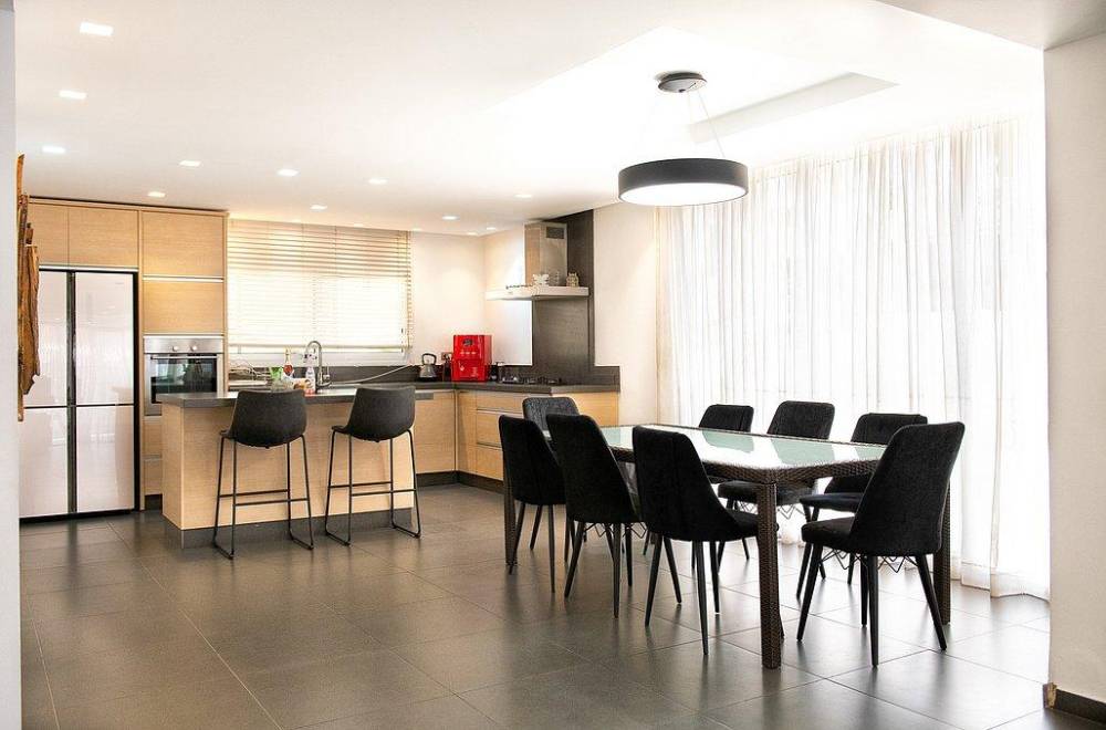 מטבח מאובזר קומפלט הכולל: מקרר עם בא מים מובנה וקרח, מיקרוגל, כיריים, תנור אפייה, טוסטר, מכונת אספרסו, קומקום חשמלי, כלי אוכל והגשה, לצידי המטבח ישנו אי + כיסאות גבוהים