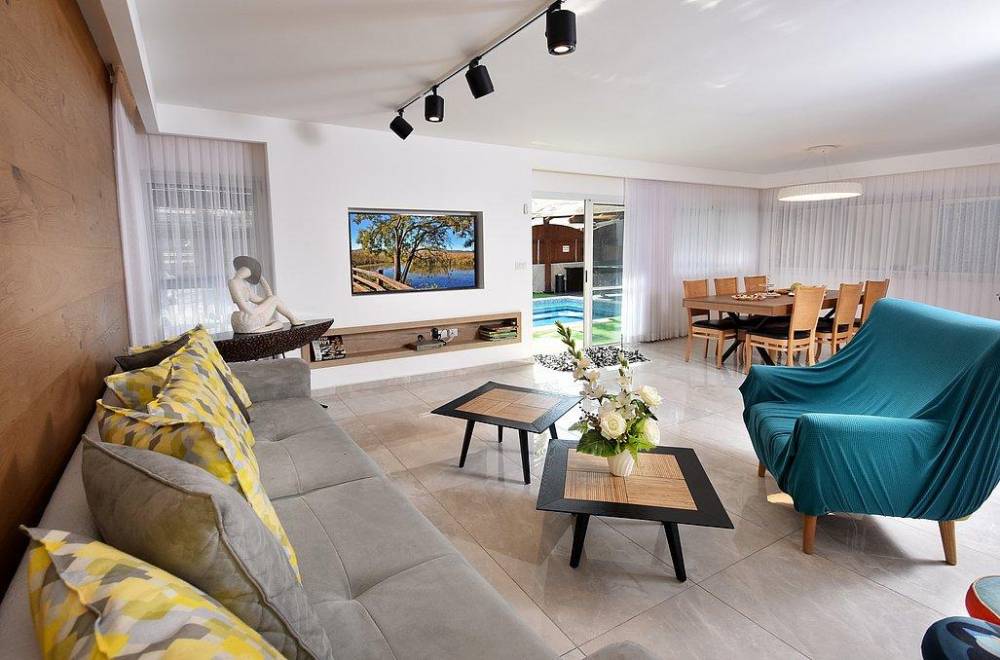 סלון עם מערכת ישיבה מרווחת וטלוויזיה עם חיבור לערוצים.