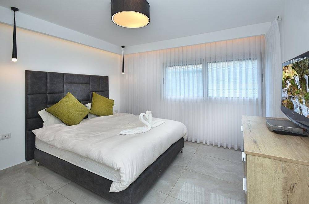 מיטה זוגית, שידות אחסון, ארון בגדים, מזגן וטלוויזיה.
