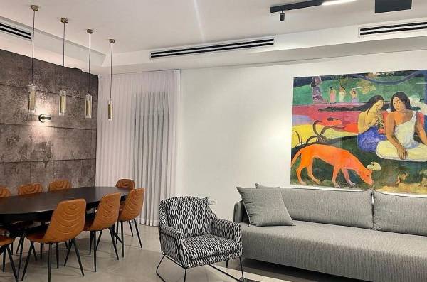 סלון הכולל מערכת ישיבה גדולה וחדשנית, טלוויזיה ופינת אוכל.
