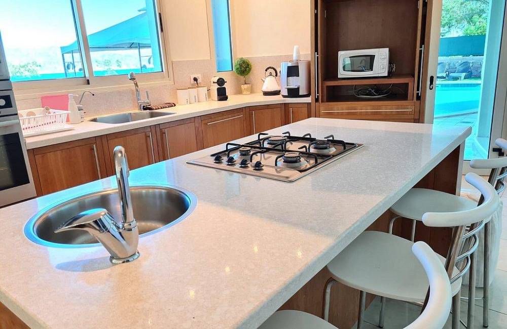 מטבח מאובזר הכולל מכונת קפה, מקרר, כיריים, קומקום חשמלי, תמי 4, מיקרוגל, כלי אוכל והגשה