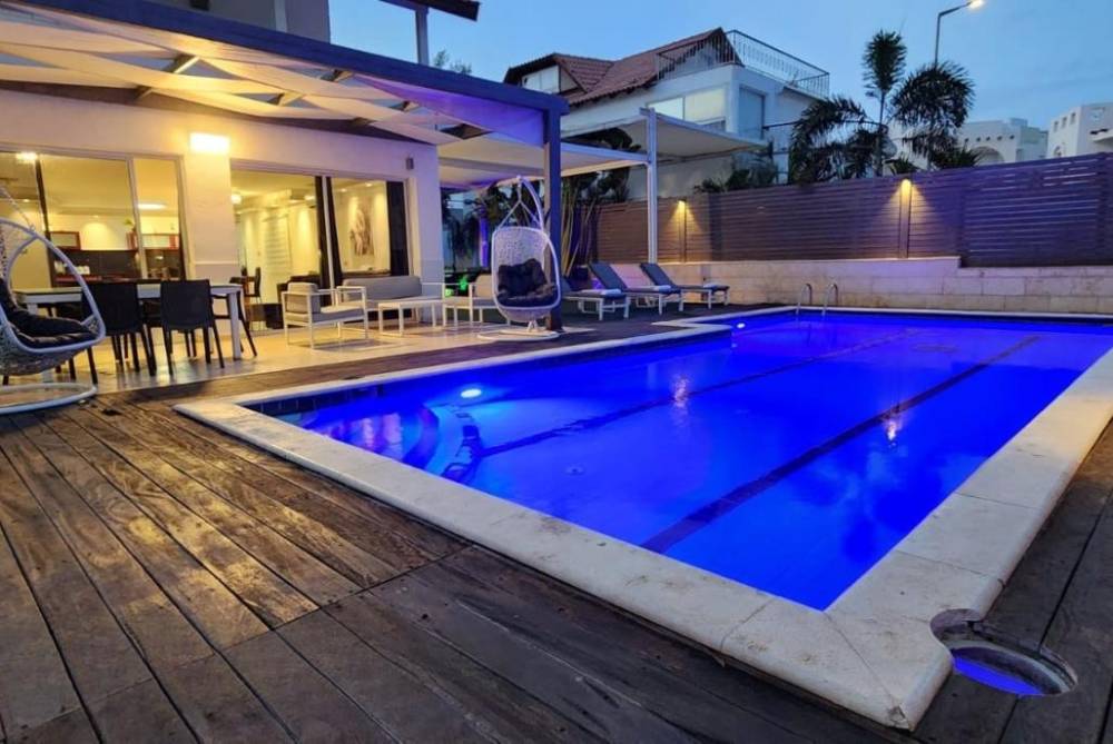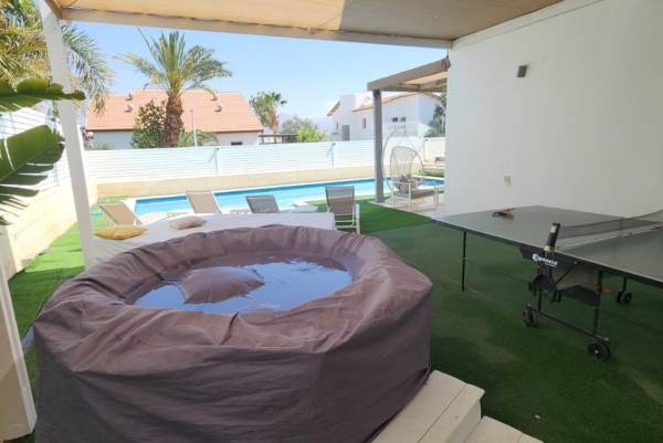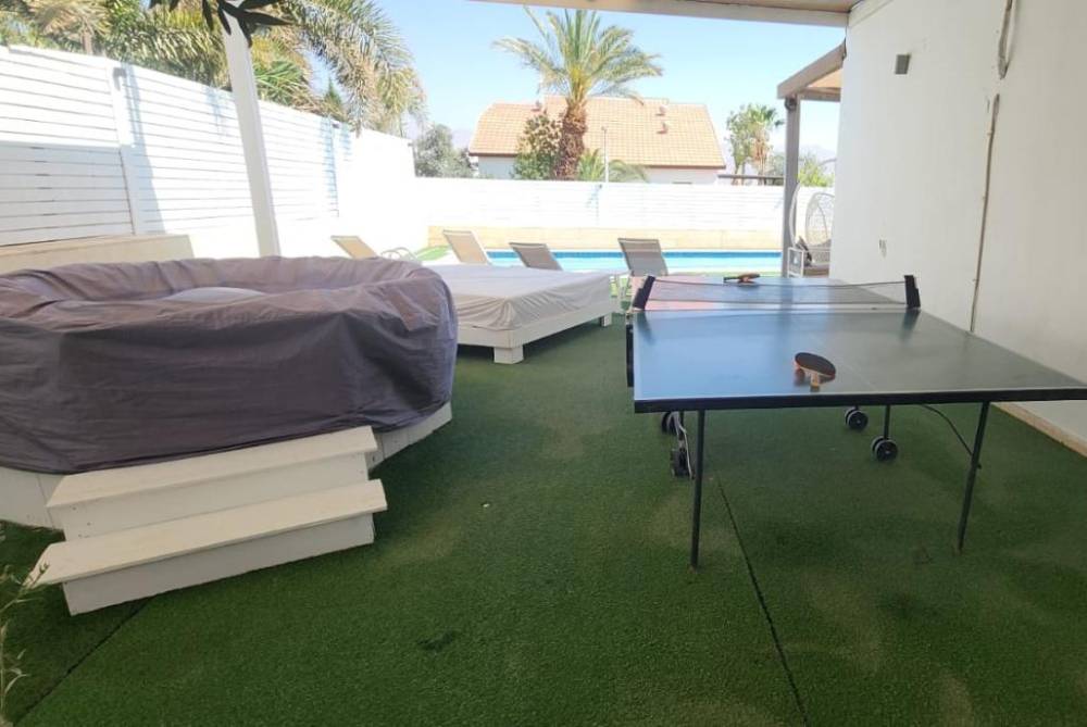 לרשות האורחים חצר מפנקת ופרטית עם בריכת שחייה גדולה ולצידה מיטות שיזוף, ג'קוזי ספא המיועד ל- 8 אנשים, פינת ברביקיו על גז, שולחן פינג-פונג ופינת אוכל ליד הבריכה.