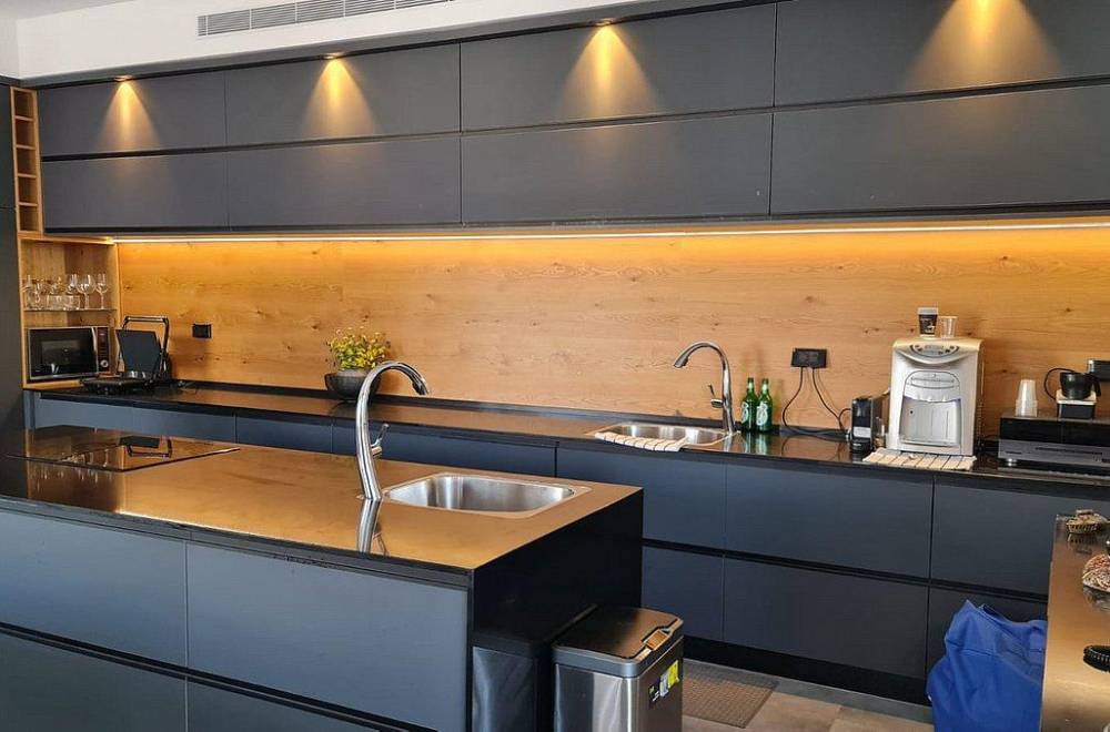 מטבח מאובזר הכולל: מקרר, תנור אפייה, כיריים גז, טוסטר, פלטת שבת, בר מים, כלי אוכל והגשה