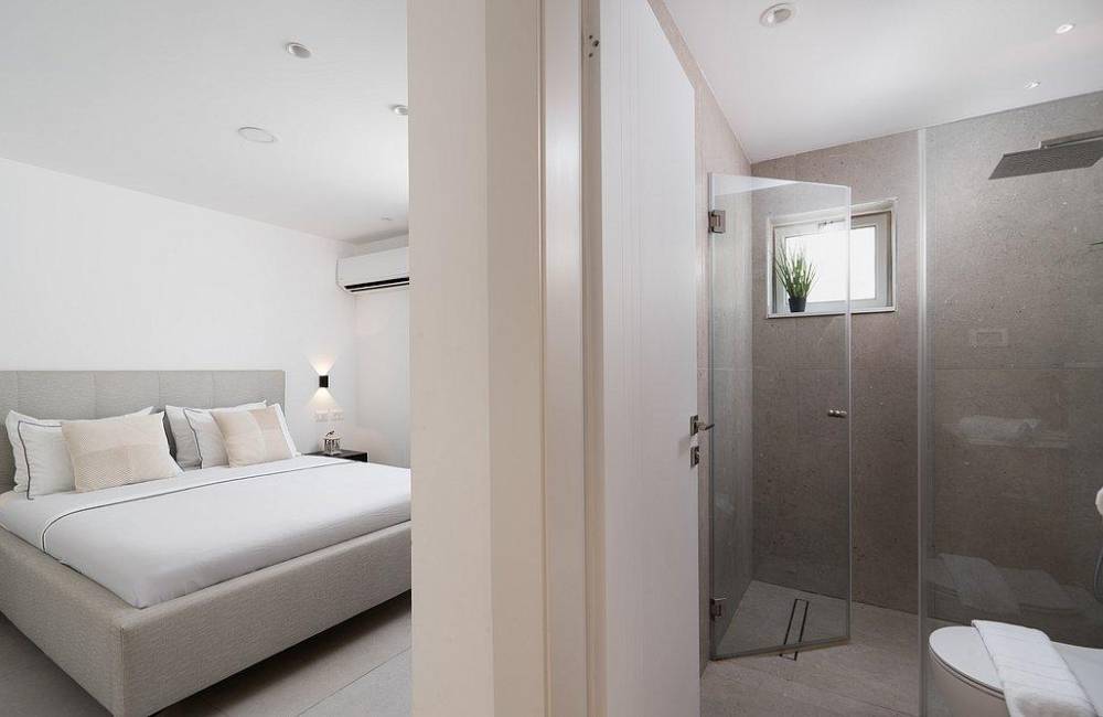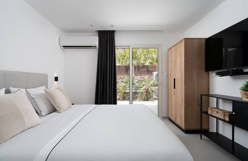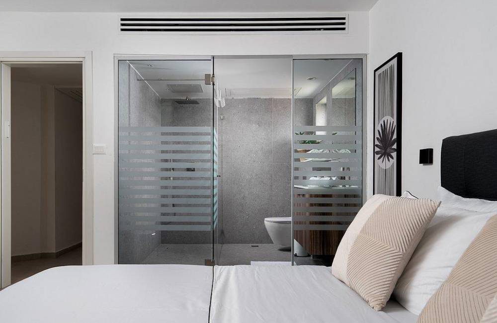 מיטה זוגית מוצעת, מיזוג אוויר, שידה, מסך LCD