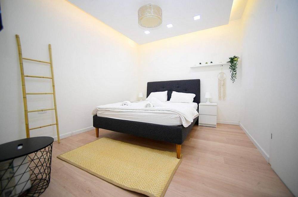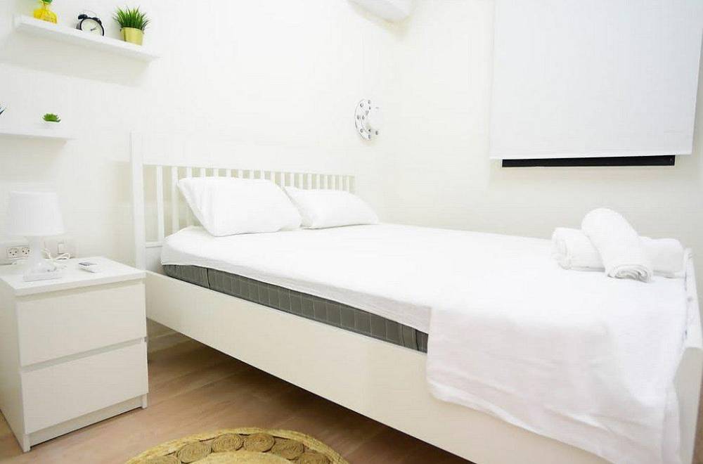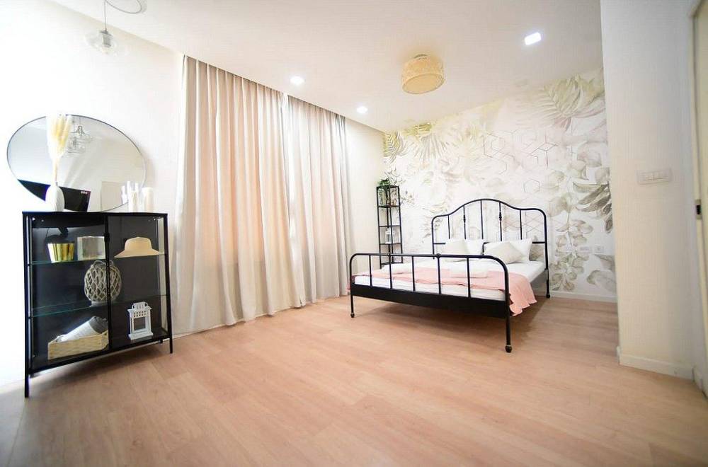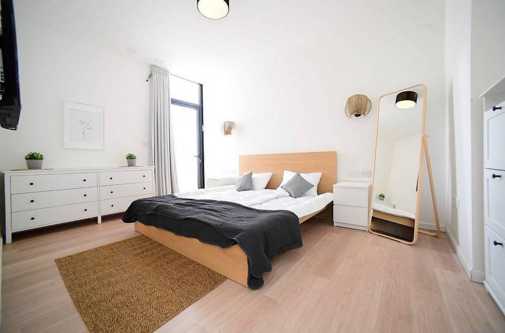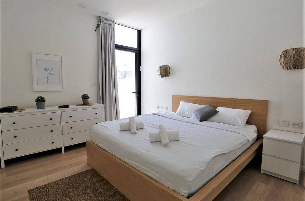 חדר שינה עם מיטה זוגית שידות וטלוויזיה וכן מרפסת צמודה