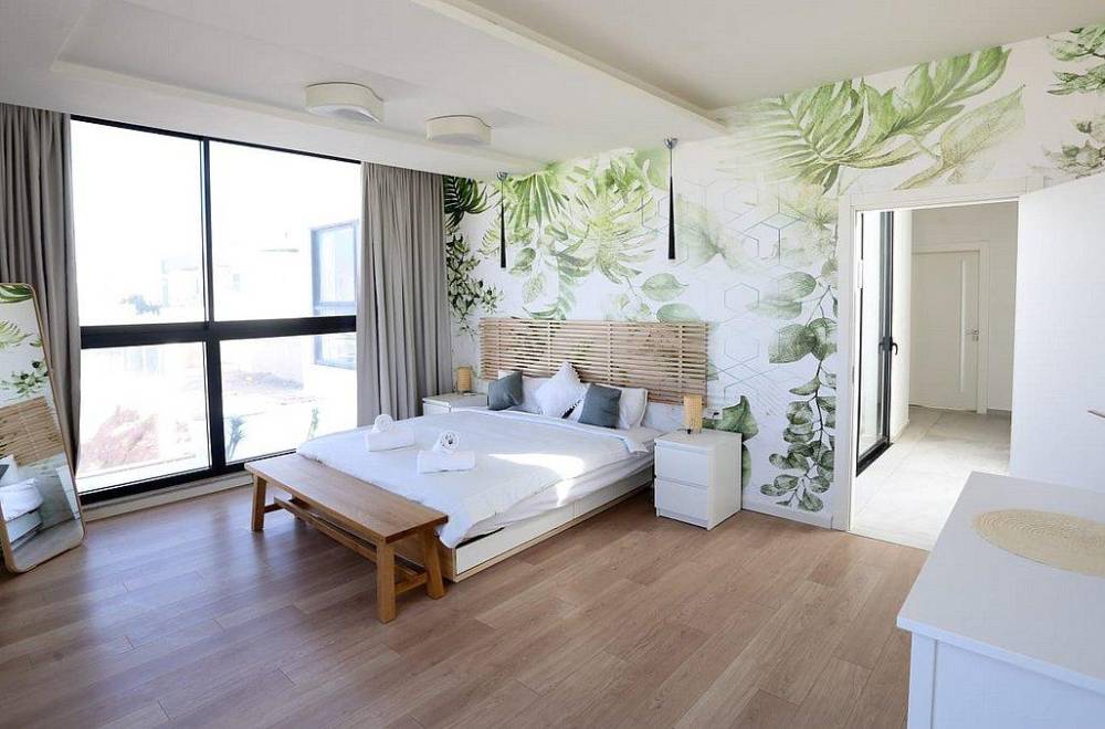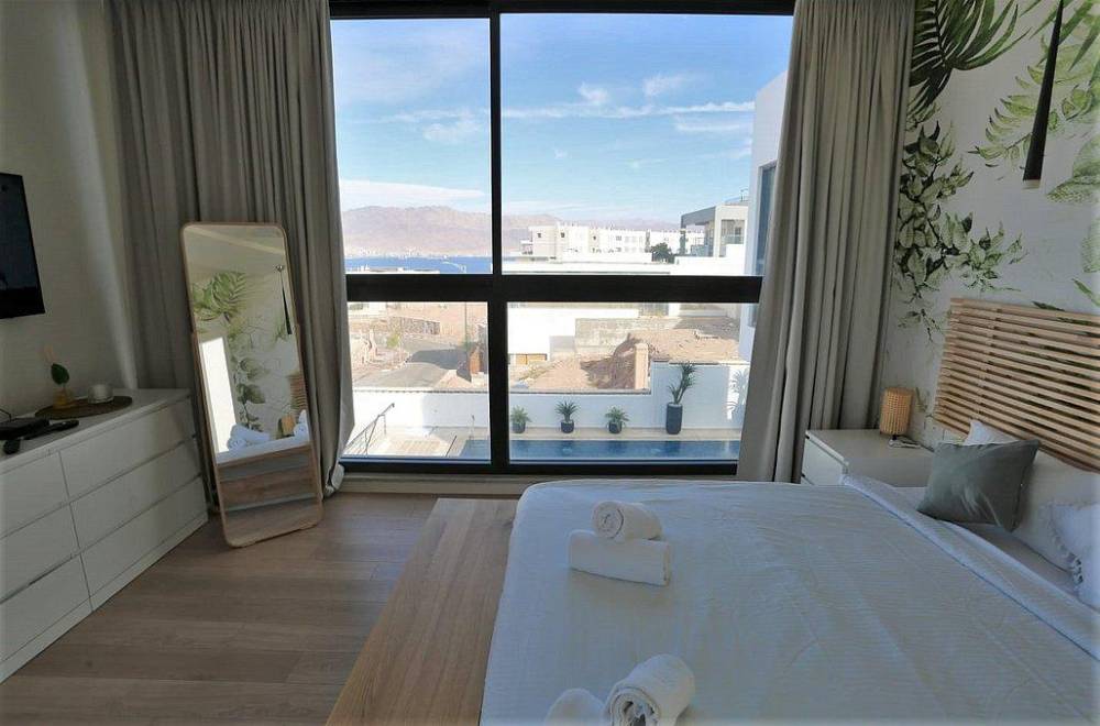 חדר שינה עם מיטה זוגית, שידות וטלוויזיה, חלונות פנורמיים לנוף הים והמפרץ