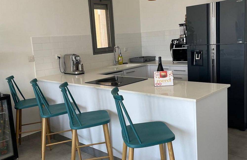 מטבח מאובזר קומפלט הכולל: מקרר, תנור אפייה, מכונת קפה, טוסטר אובן, כיריים אינדוקציה, מקרר יינות, קומקום חשמלי, מיקרוגל