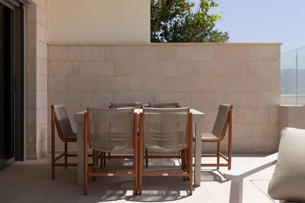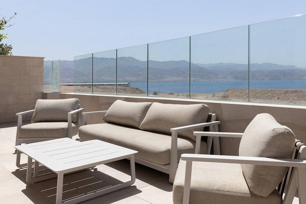 - מיטת שיזוף, ריהוט גן ופינת ישיבה מול נוף לים