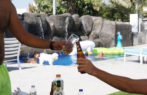 עמדת ברביקיו ולצידה בר מאובזר במכונת קרח, מקפיא, כיריים גז ומקרר