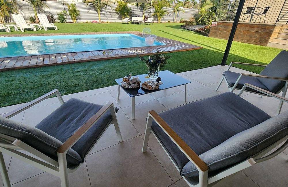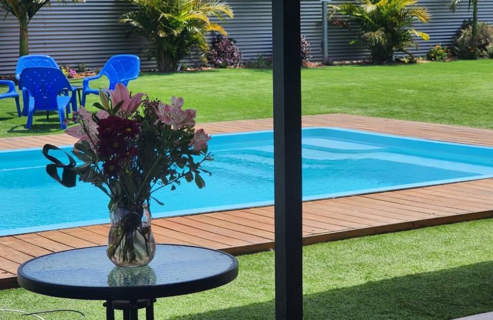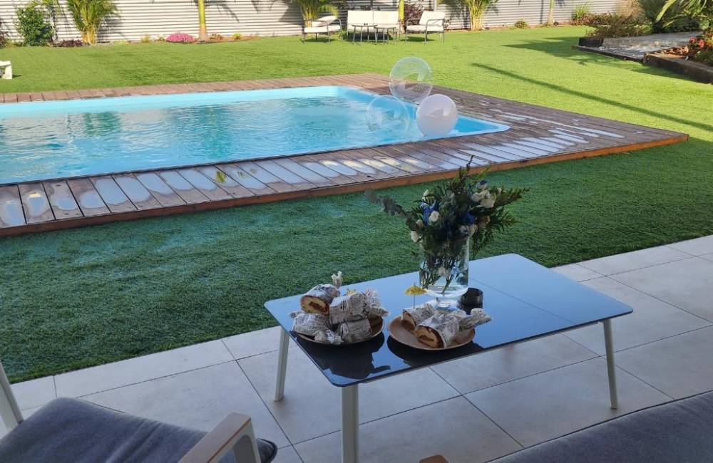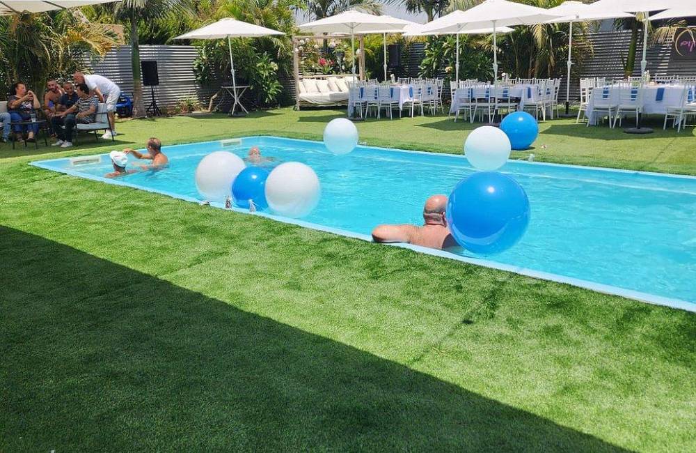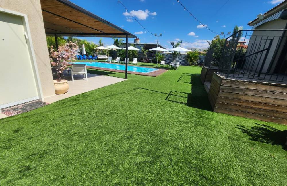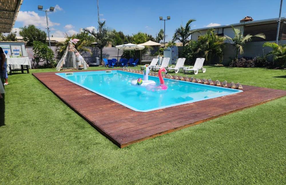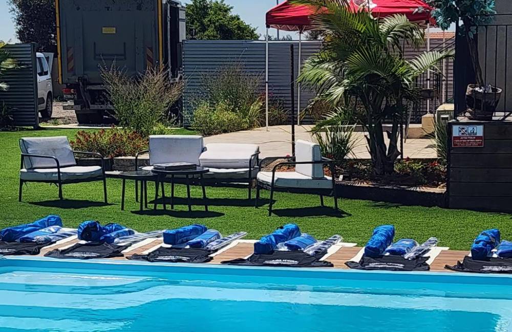בריכת שחייה גדולה ומחוממת, סביב הבריכה מדשאות ואזורי שיזוף