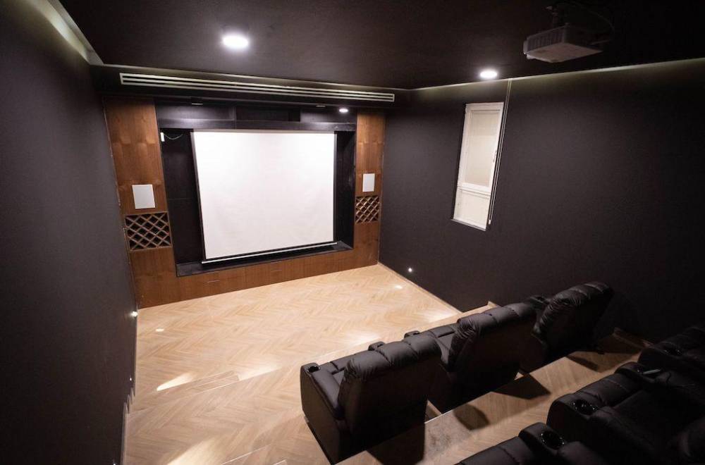 חדר קולנוע הכולל מקרן ומערכות ישיבה