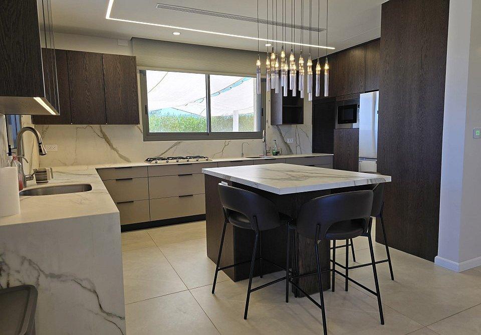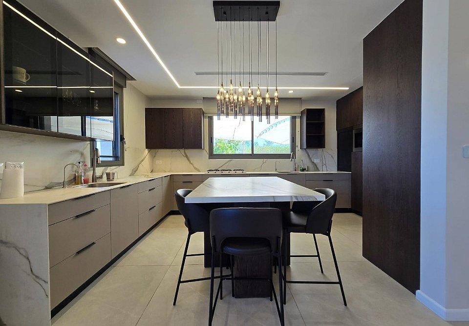מטבח מאובזר: מקרר, שני תנורים, שני כיורים, מדיח כלים, מיקרוגל, מכונת קפה, מיחם, פלטה, כלי אוכל והגשה
