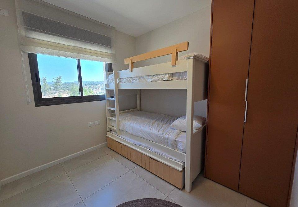 חדר ילדים הכולל מיטת יחיד עם מיטת חבר ומיטת קומותיים