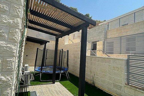 יציאה למרפסת הכוללת טרמפולינה לילדים ומגוון עצי פרי
