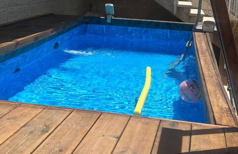 מתחם חיצוני מפנק בעל 200 מ"ר של גינה מטופחת עם בריכת שחייה, פינות ישיבה חיצוניות, פינת מנגל, נדנדות, ואווירה של חופש אמיתי.