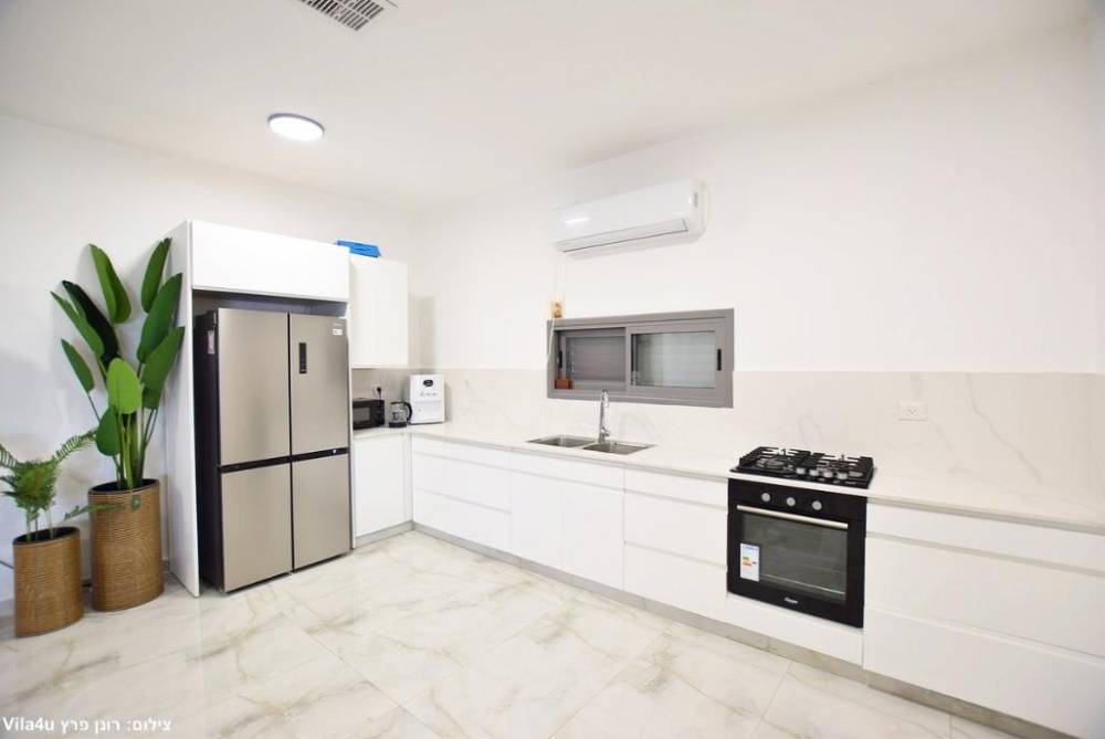 מטבח מאובזר ובו: מקרר, מיקרוגל, תנור כיריים גז, מתקן מים, קומקום חשמלי
