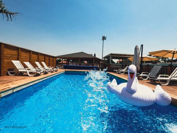 בריכת שחייה גדולה ובאירועיםנויה עם דק מפואר מסביבה, מפלי מים. גודל הבריכה 10 על 5