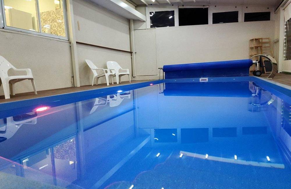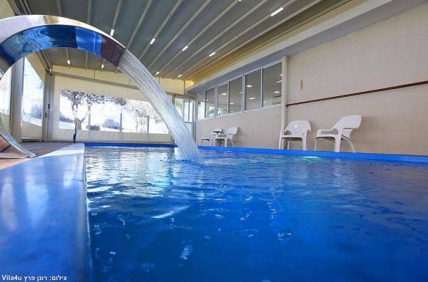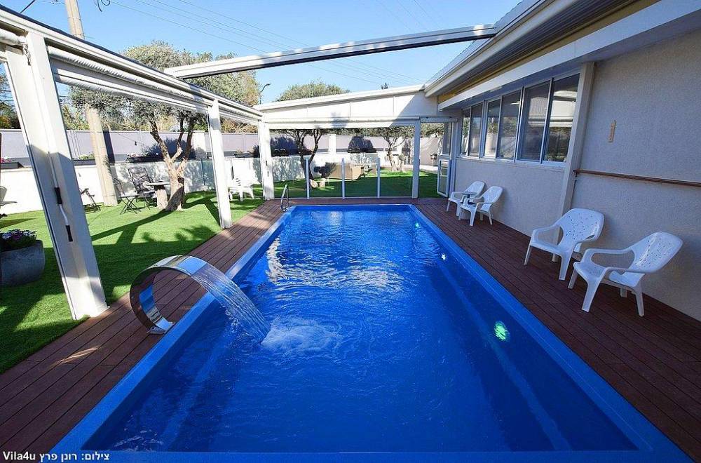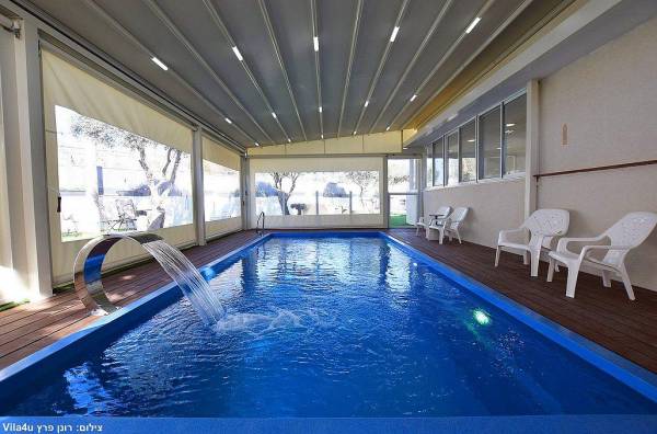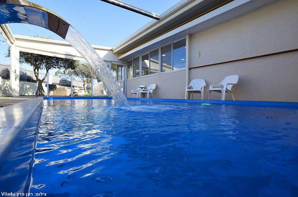 בריכת שחייה בגודל 7X3 עם מפל מים, הבריכה מחוממת מקורה בחודשי החורף וכוללת סוכך חשמלי נפתח ונסגר