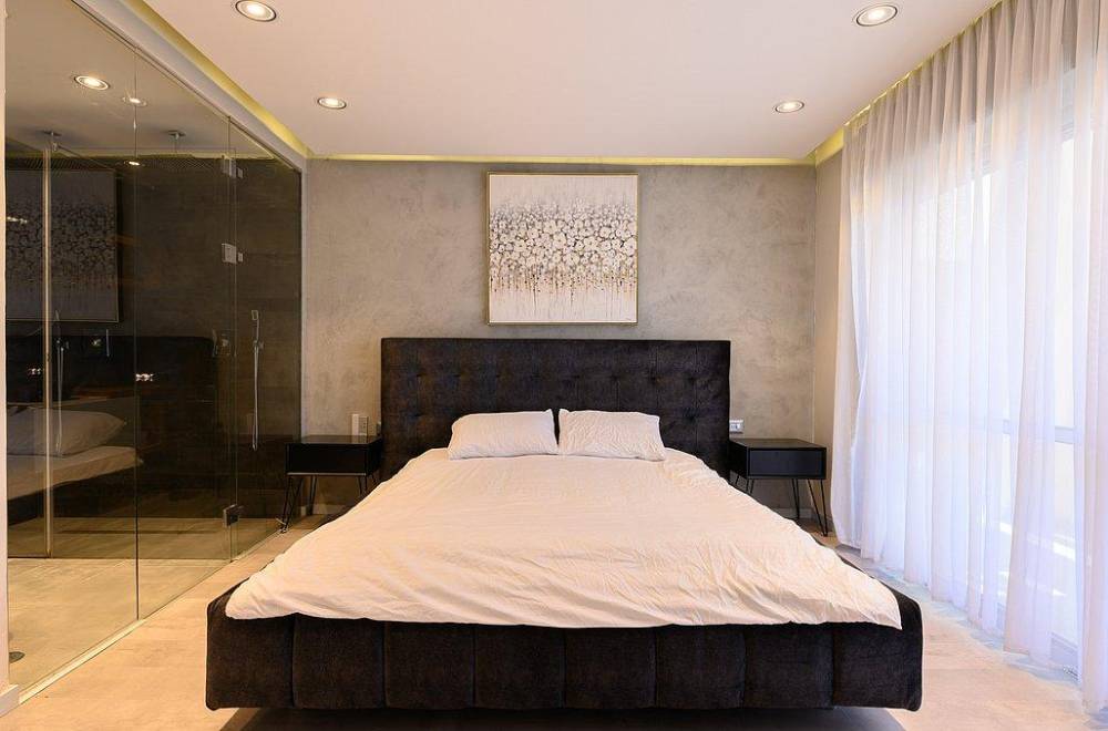 חדר שינה > מיטה זוגית קינג סייז, טלוויזיה בגודל 50 אינץ עם חיבור לHOT, מזגן, שידות לאחסון וקומודה.