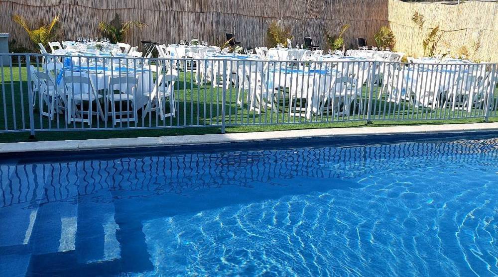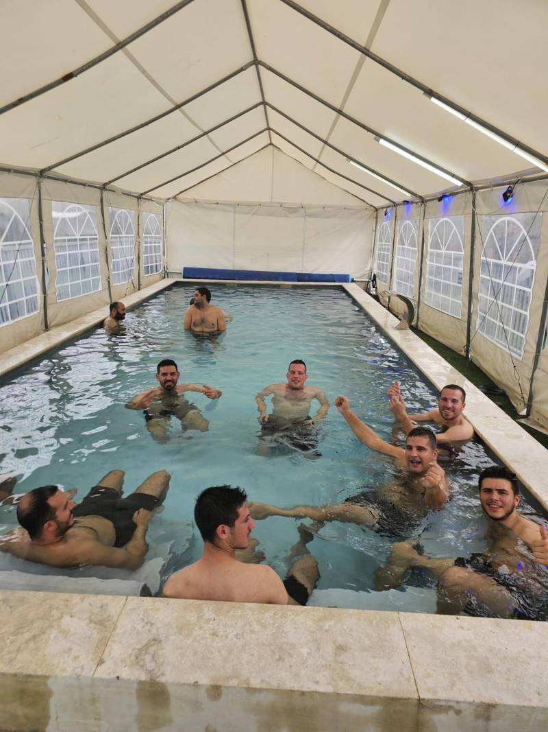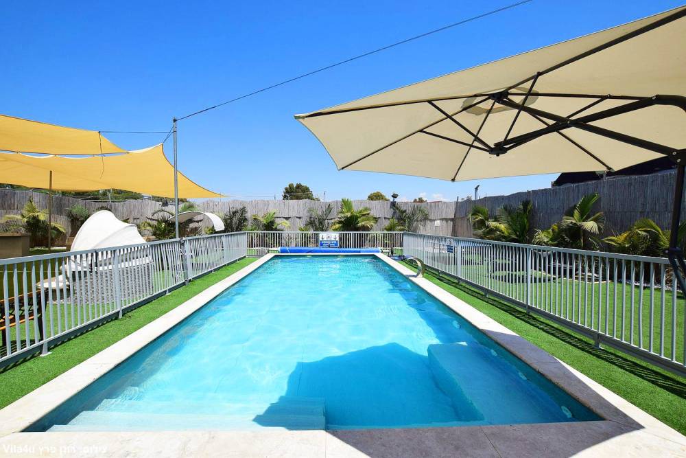 בריכת שחייה עם מפל מים בגודל 10X5 עומק מטר עד 1.50 קיים ג'קוזי ספסל ג'קוזי עם 12 ג'טים