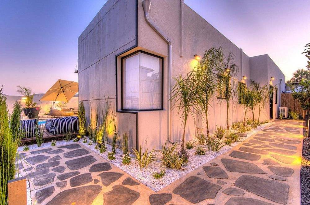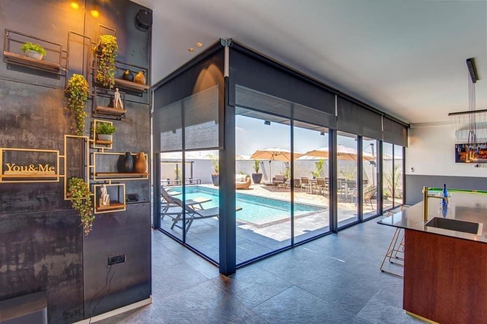 כל המתחם פונה לעבר הבריכה תחום בוויטרינות גדולות ומרשימות המשקיפות על החצר כולה
