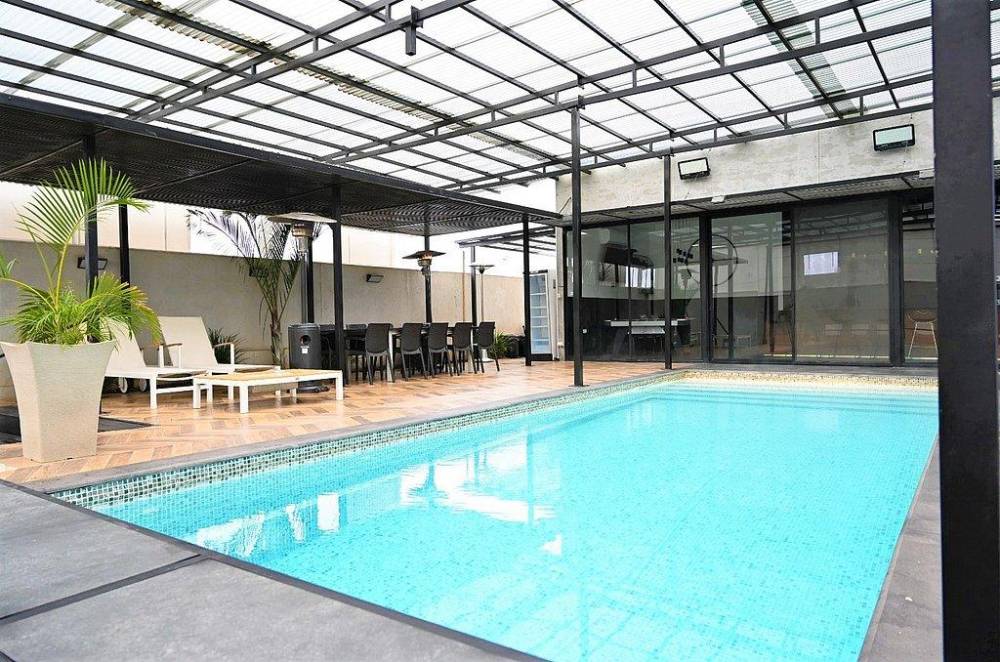חצר יפיפייה עם מדשאות, בריכת שחייה מחוממת, מקורה ומקצועית מחופה דק עץ מדהים