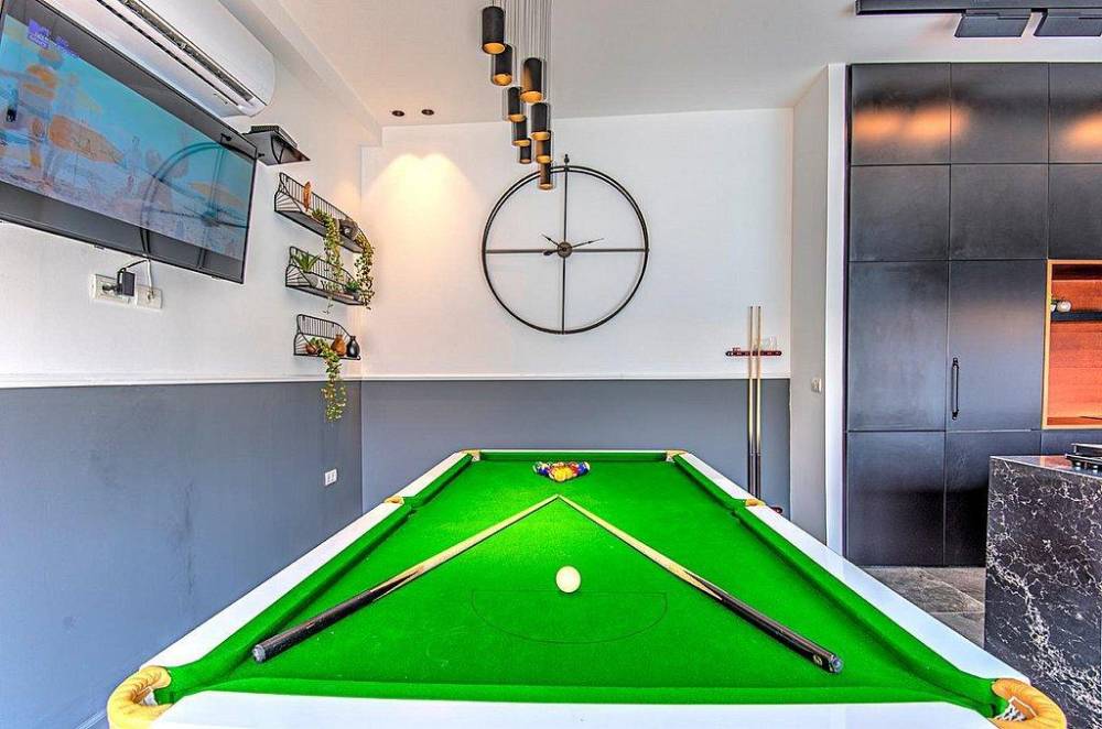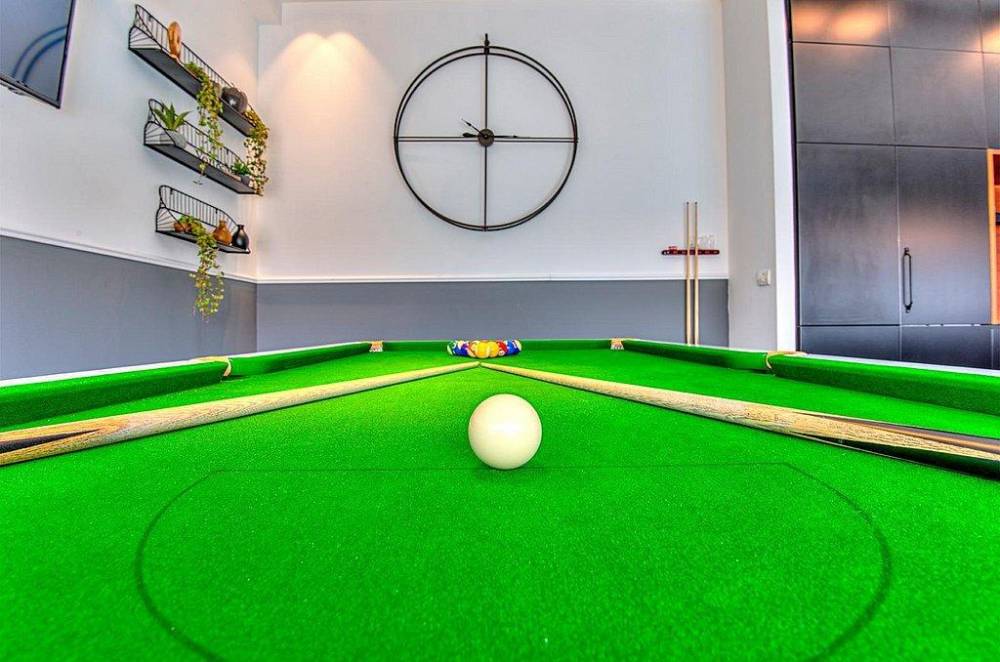 לצד האי והמטבח ניצב שולחן סנוקר מקצועי ומולו מסך LCD