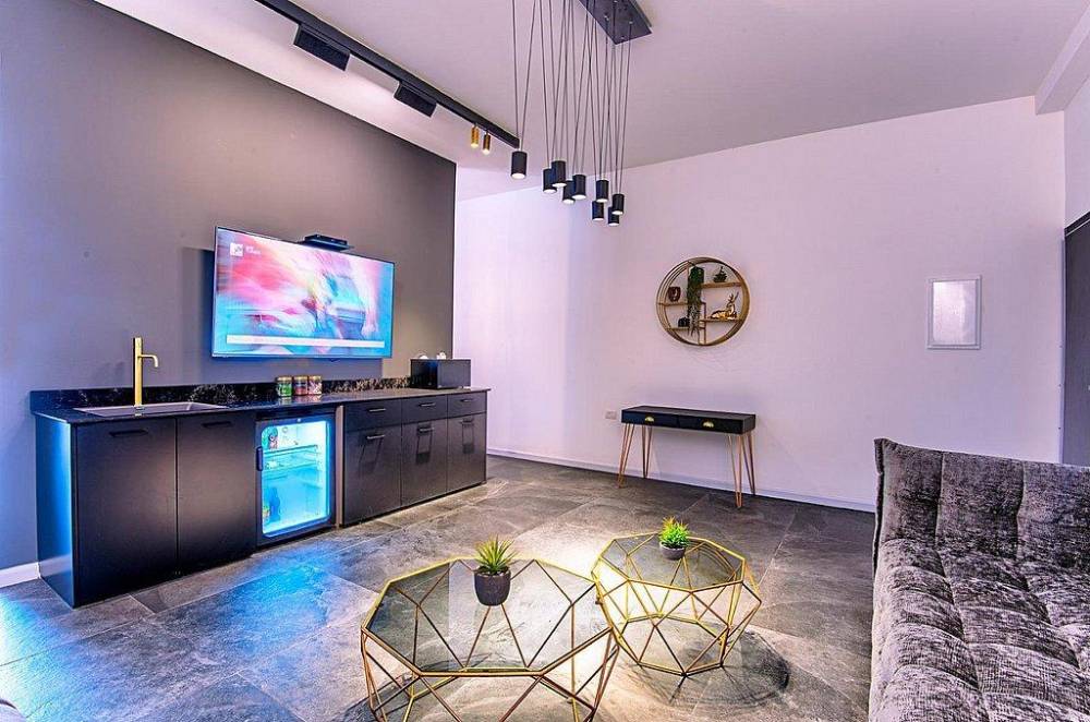 סלון יוקרתי ומודרני עם מערכות ישיבה איכותיות, תאורה מדהימה ומסך טלוויזיה