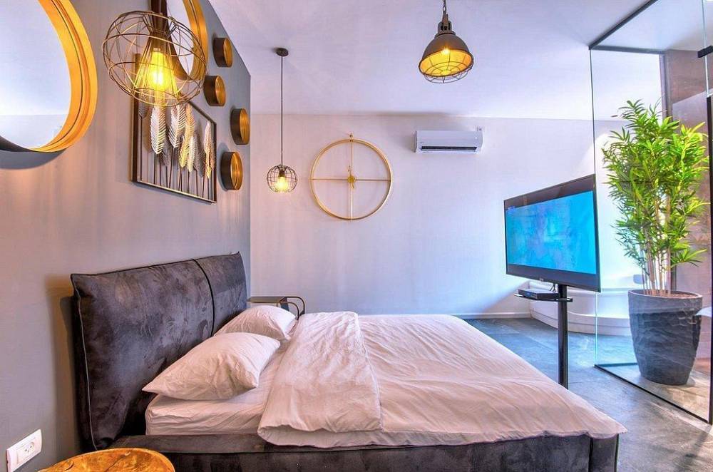 3 חדרי שינה – מסך טלוויזיה, מיטה זוגית, מזגן, שידות, ויטרינה עם וילונות חשמליים מול הבריכה