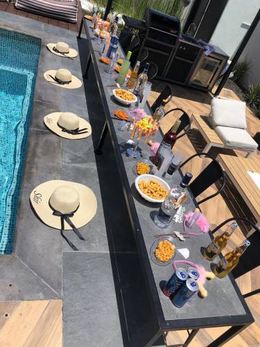 בר מובנה עם כיסאות ישיבה גבוהים מול הבריכה