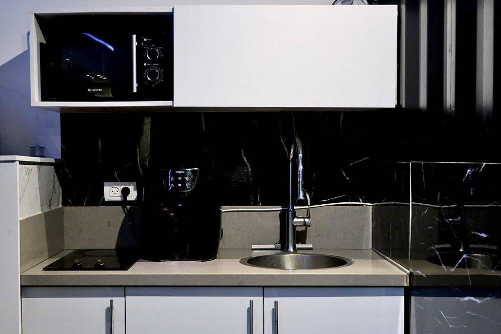 מטבחון מאובזר הכולל: מקרר גדול, כיריים חשמליות, מיקרוגל, מתקן מים, פלטה ומיחם