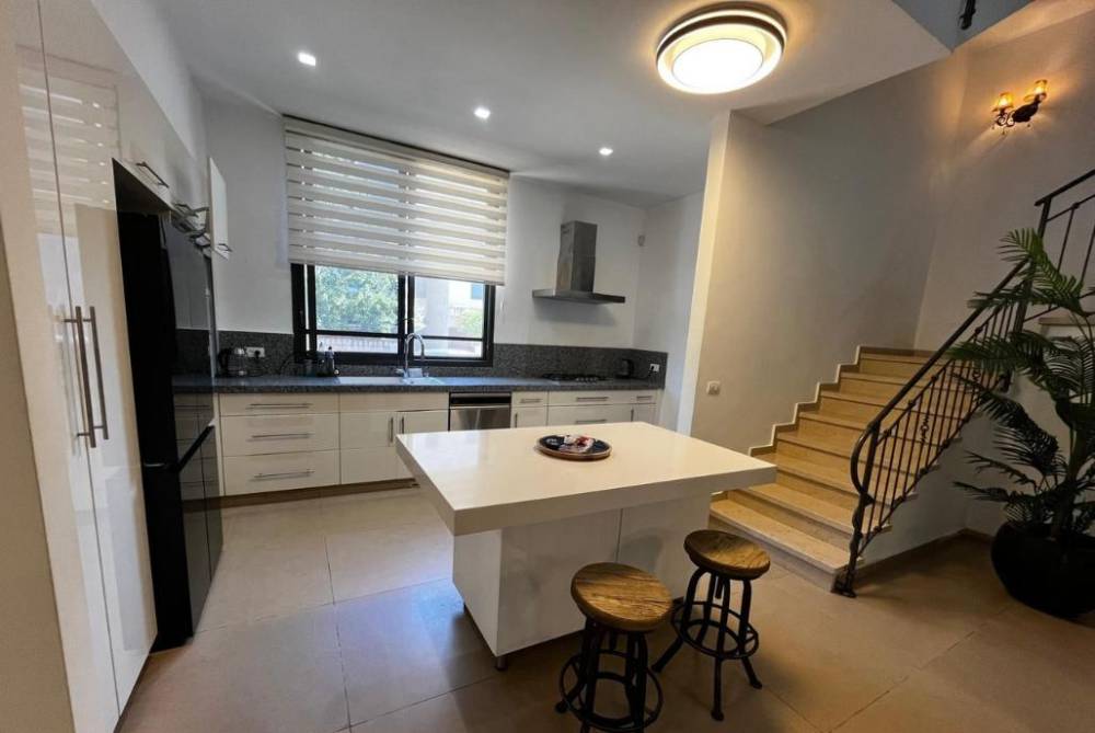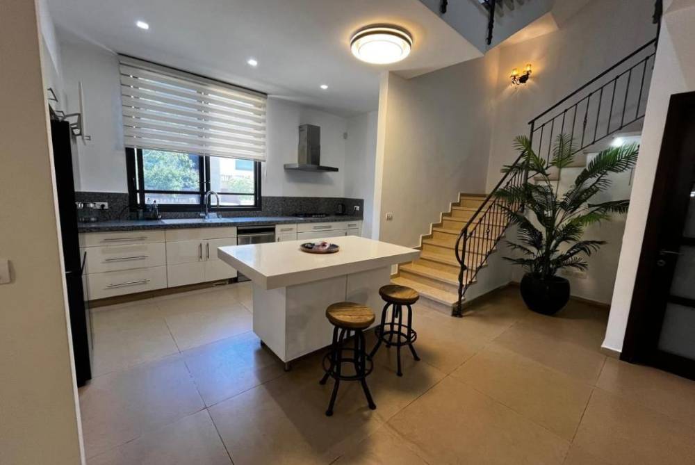 מטבח מאובזר הכולל: מקרר, מקפיא, תנור אפייה, כיריים גז, מיקרוגל, קומקום חשמלי, כלי אוכל והגשה