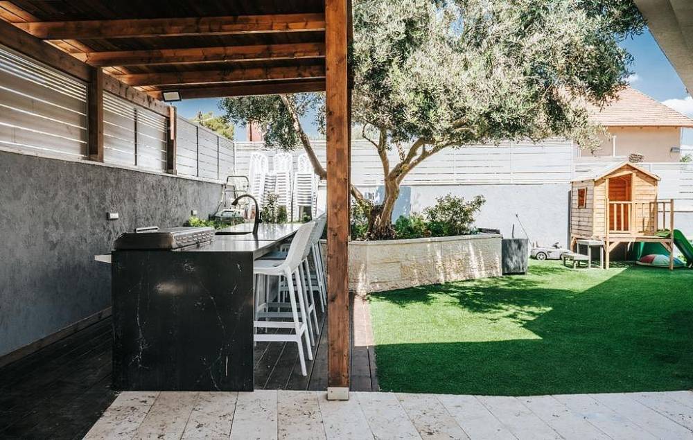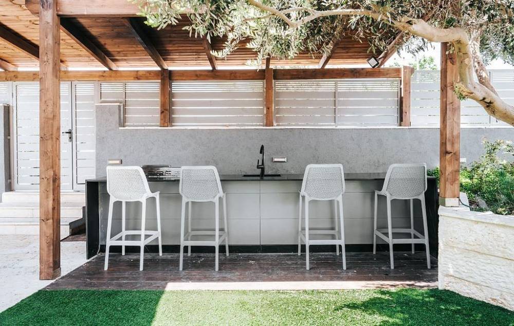 - מטבח חוץ עם מנגל ענק מאובזר במקרר, כיריים וכיור