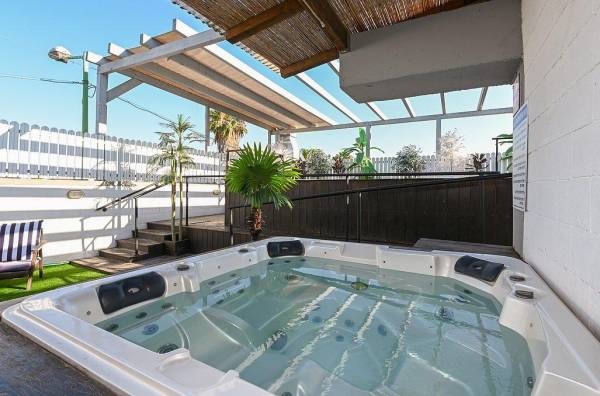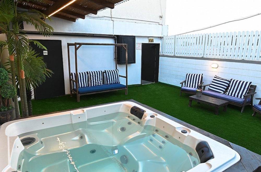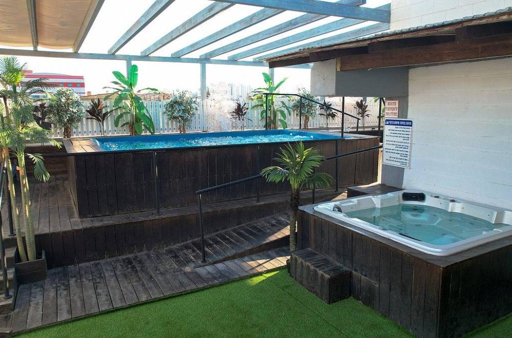 ג'קוזי ספא גדול ומחומם עם ספסלי ישיבה ומשענות ראש