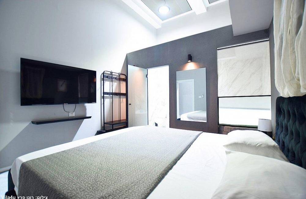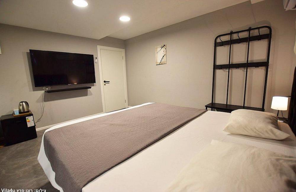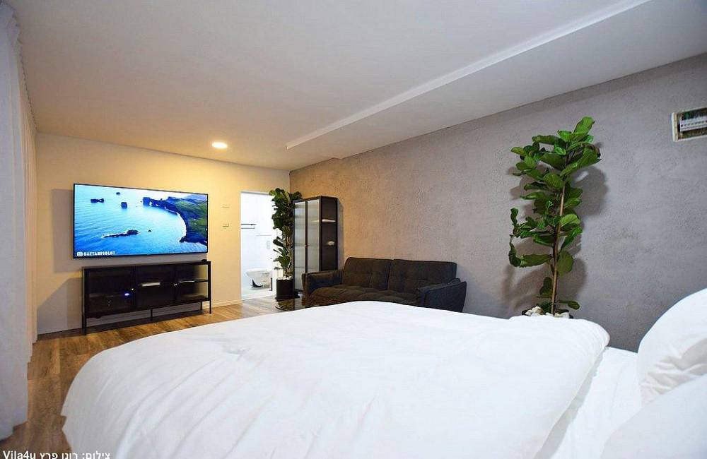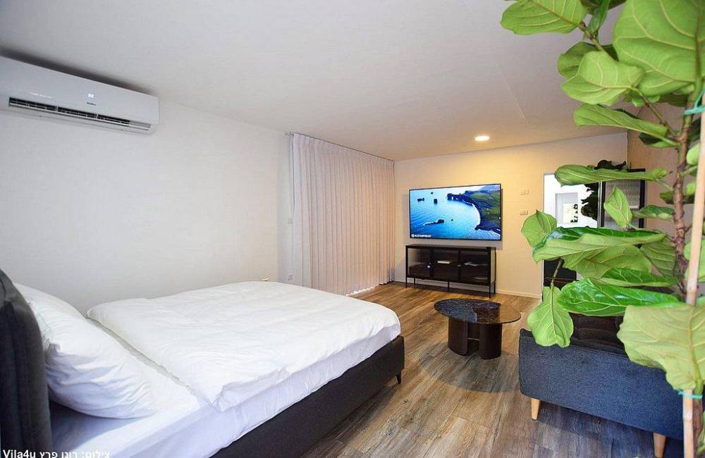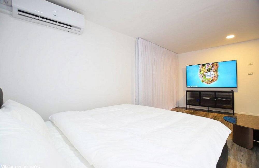 מיטה זוגית, טלוויזיה, מיזוג אוויר וחדר לרחצה.