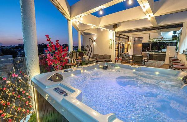 מרפסת גדולה פרטית עם ג'קוזי ספא מפנק, שולחן וכיסאות אל מול נוף יפואי אותנטי ומרהיב
