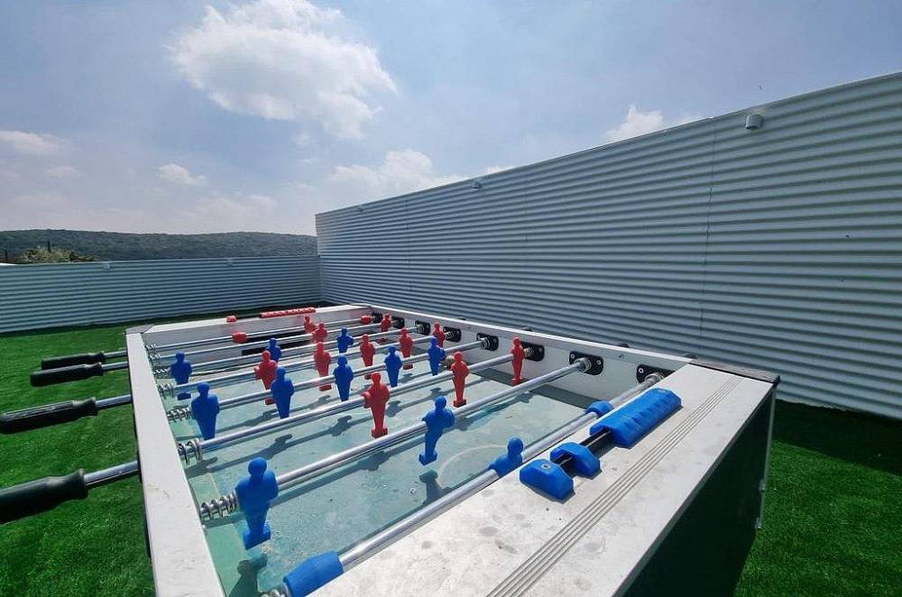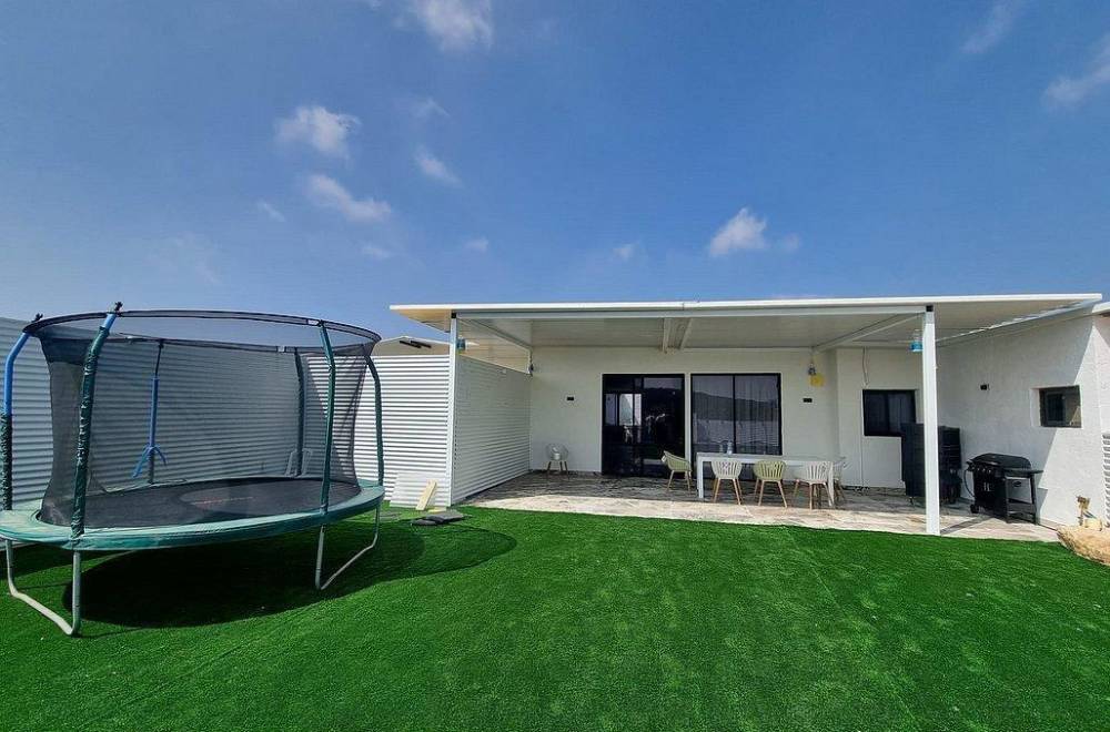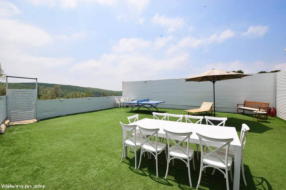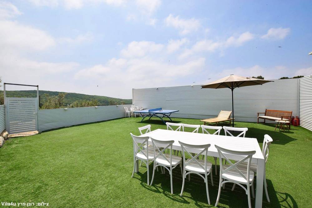 חצר עם מדשאות, שולחן פינג פונג וכדורגל, עמדת מנגל, פינת אוכל מקורה