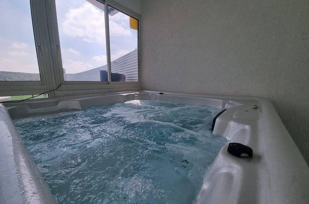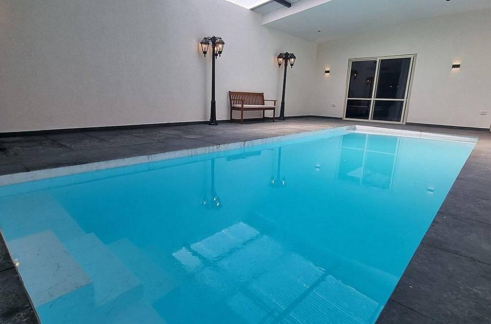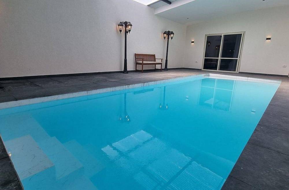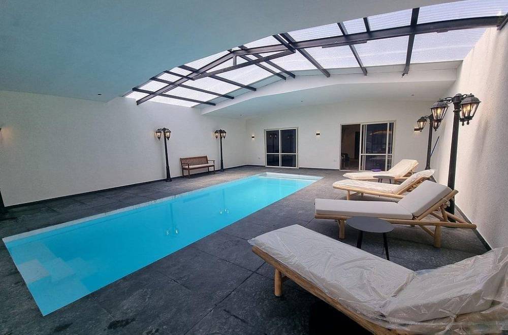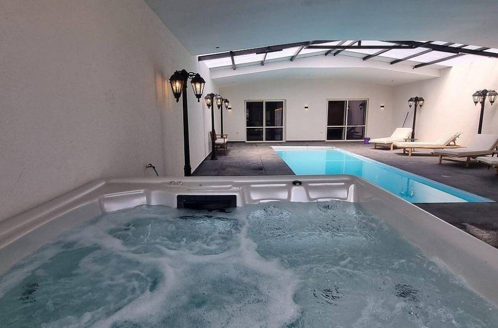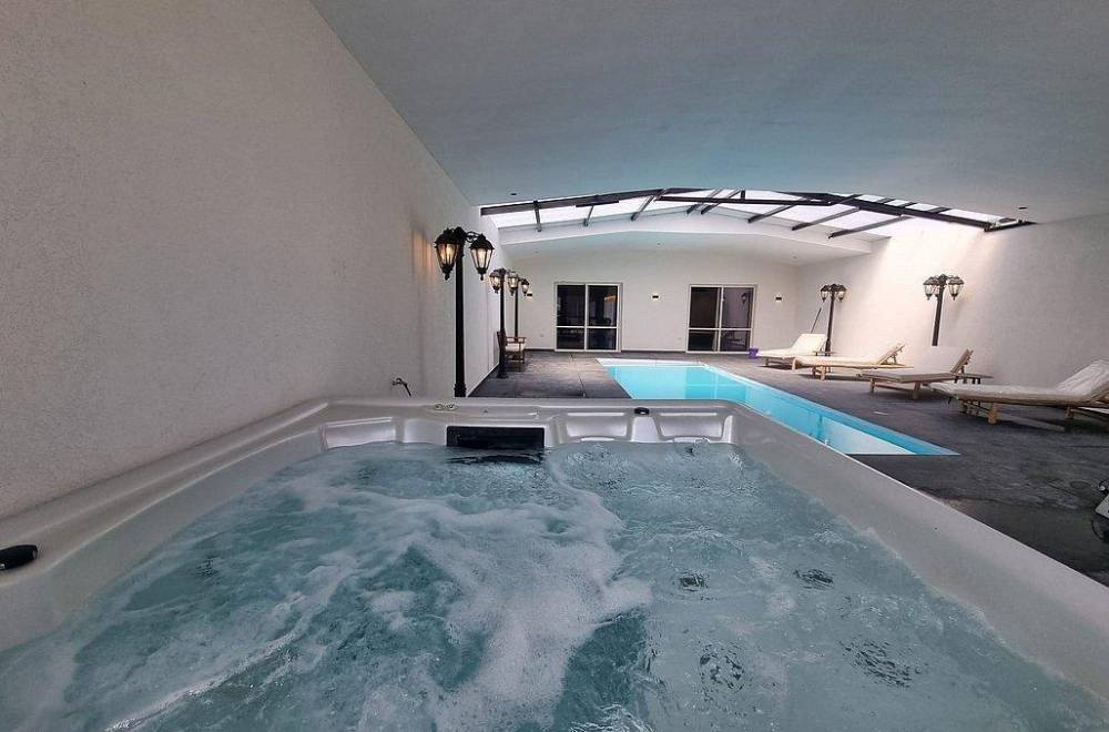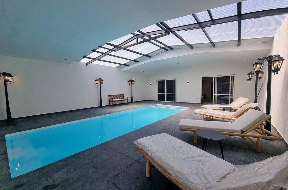 אבזור החצר: מתחם מקורה עם בריכת שחייה מחוממת, ג'קוזי ספא, מיטות שיזוף ופינות ישיבה