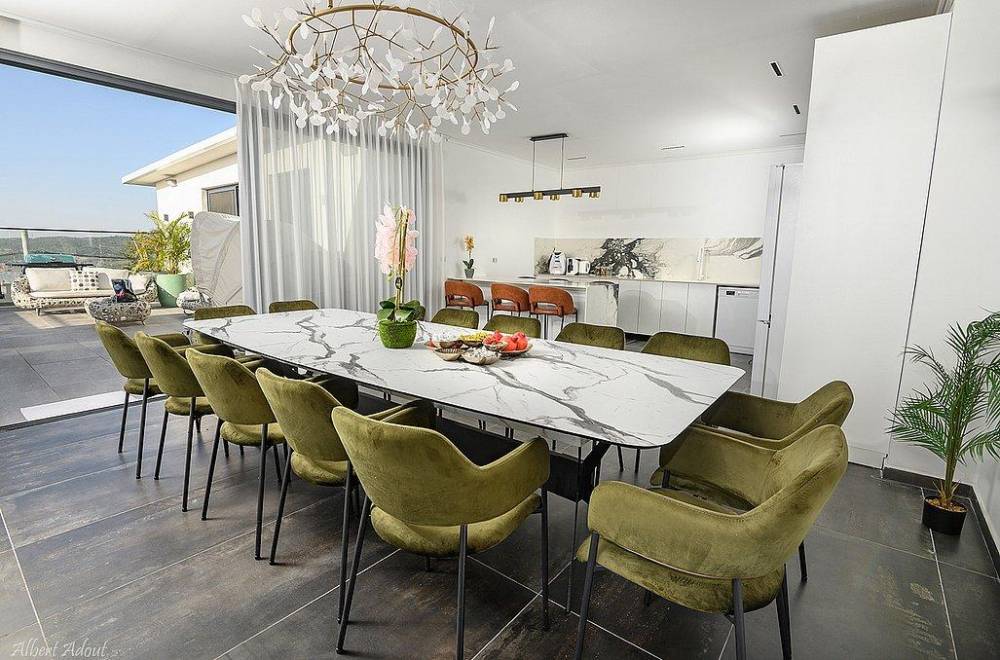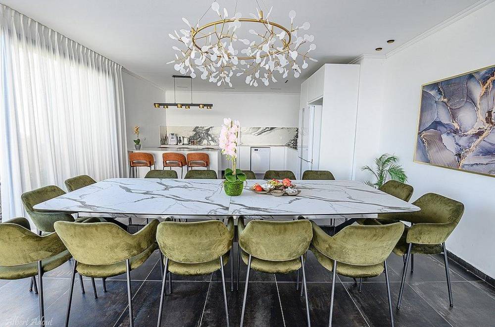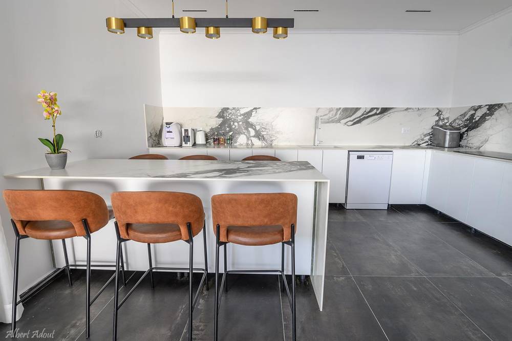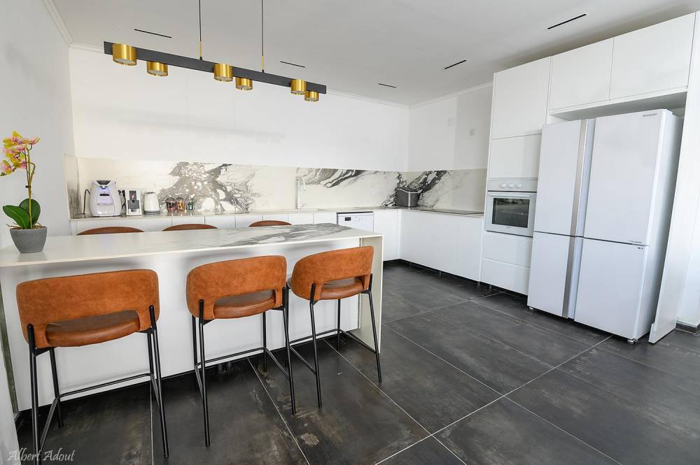 מטבח מאובזר הכולל: מקרר, מיקרוגל, כיריים אינדוקציה, מדיח, מכונת קרח, מכונת קפה, תמי 4, כלי אוכל והגשה