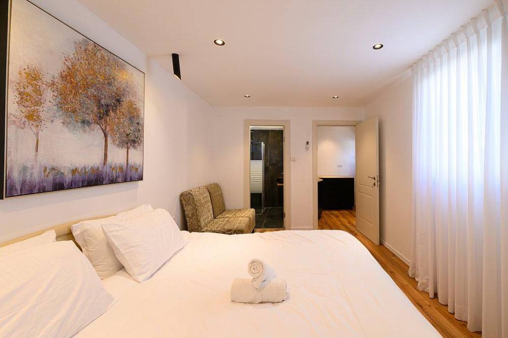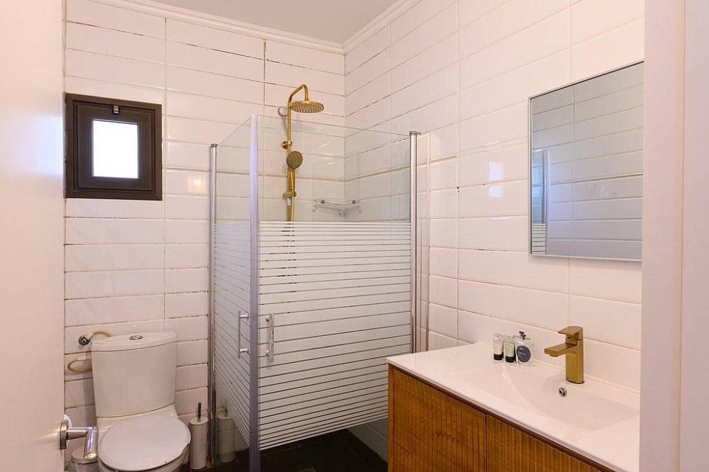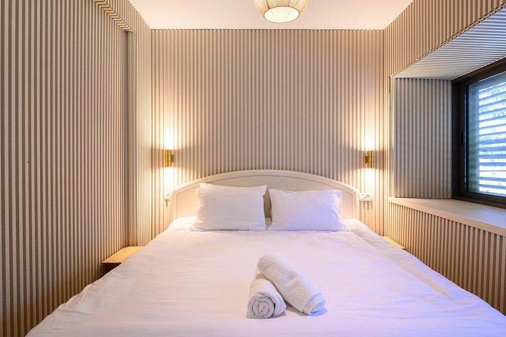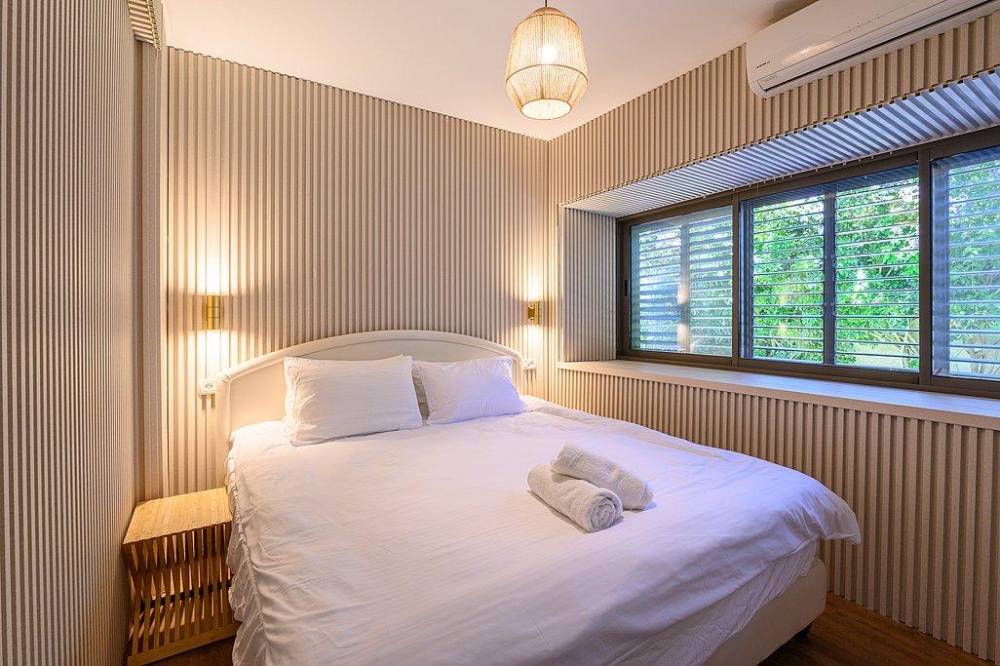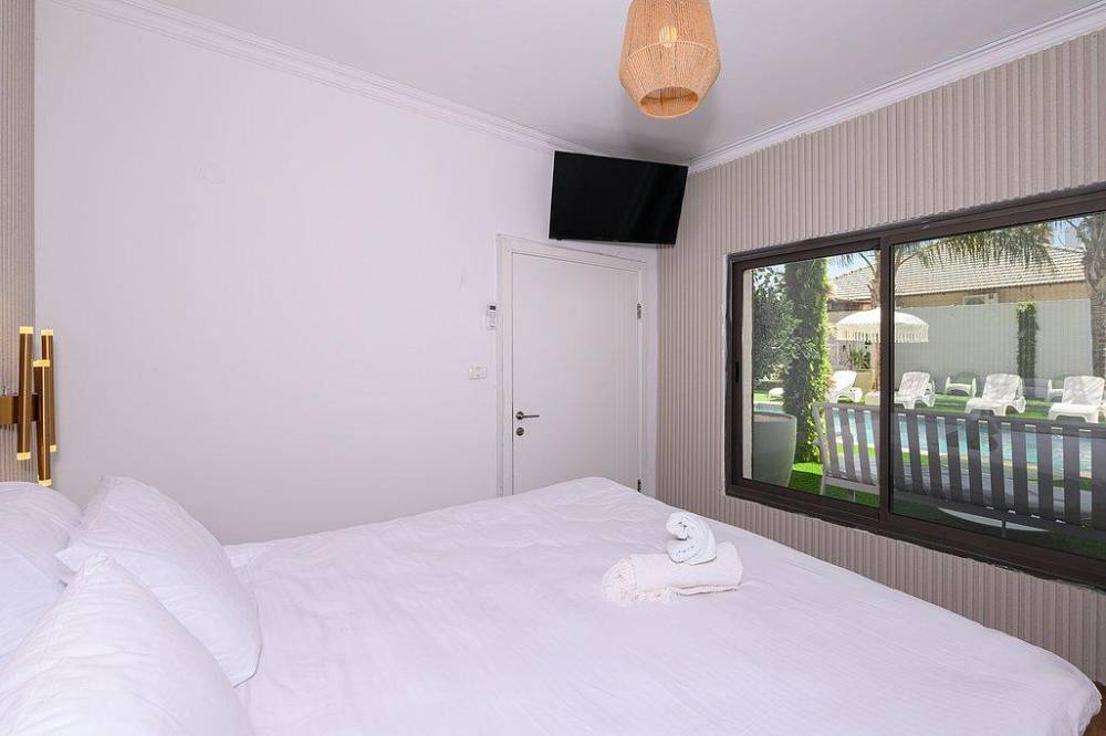 אבזור חדרי השינה בוילה: מיטה זוגיות מוצעת, מזגן, טלוויזיה, שידות