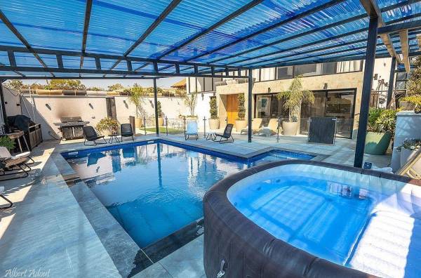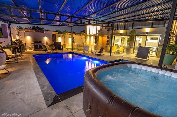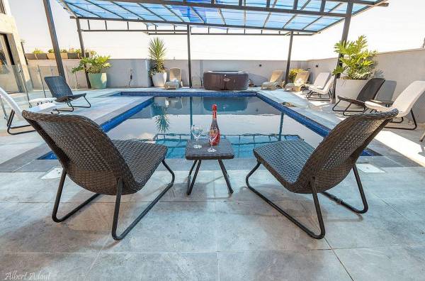 המתחם החיצוני מציע חוויית אירוח עשירה עם בריכת שחייה מחוממת ומקורה, ג'קוזי ספא לוהט, פינות ישיבה, אזור מנגל, מיטות שיזוף ונוף עוצר נשימה.