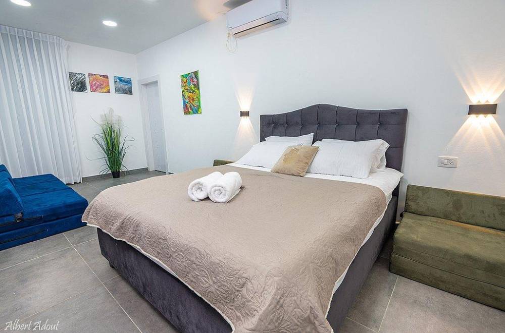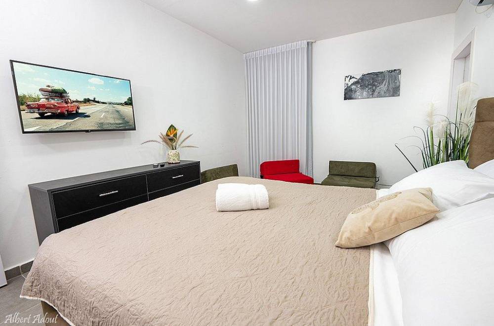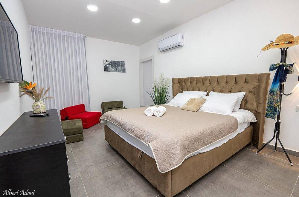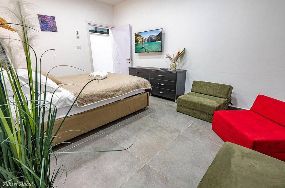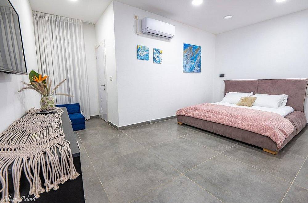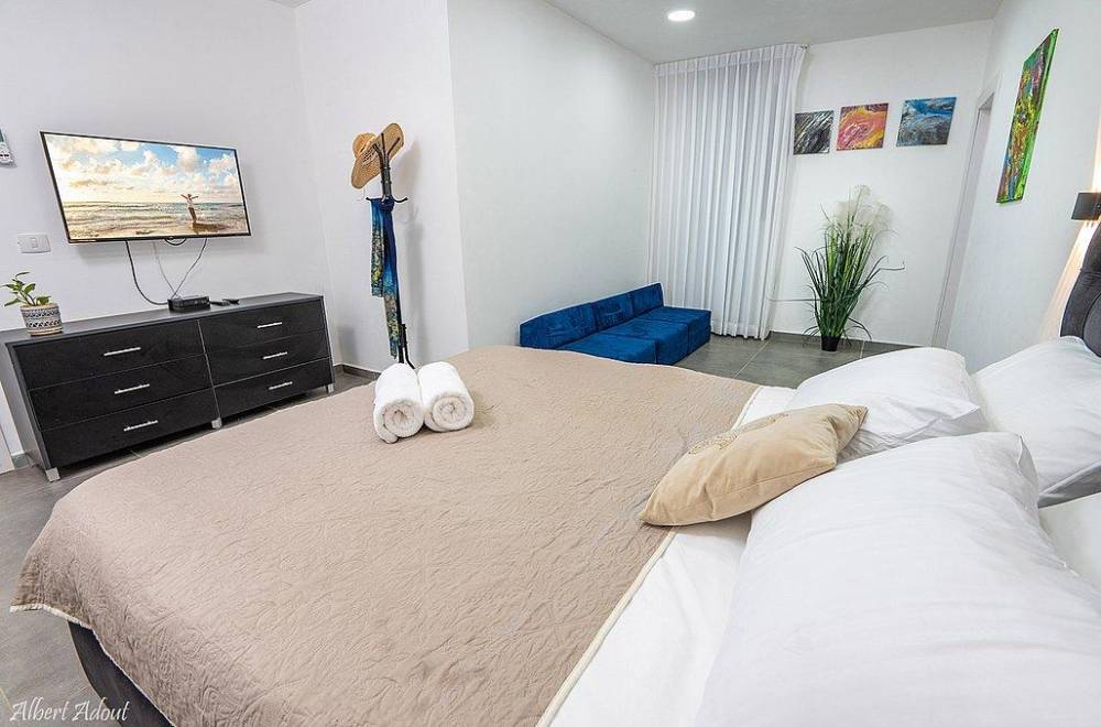 מיטה זוגית, מיזוג אוויר, שידות, פינת ישיבה ומסך צפייה