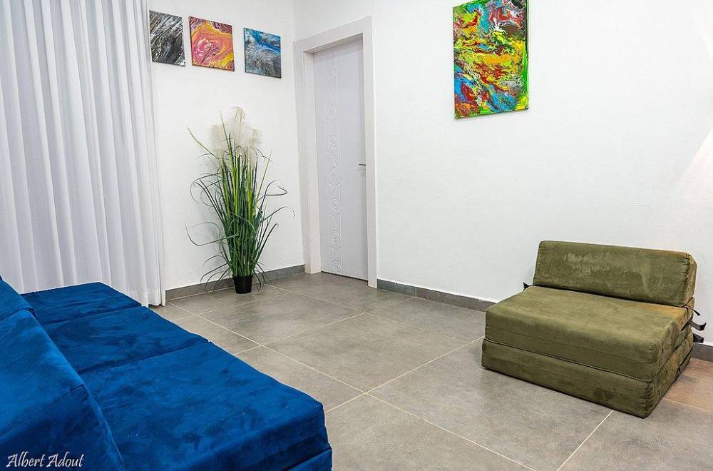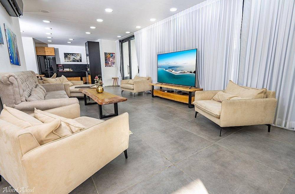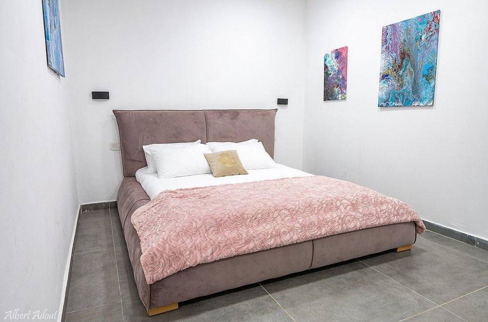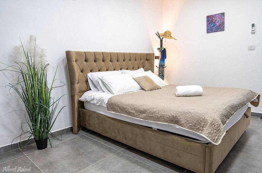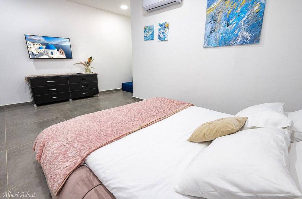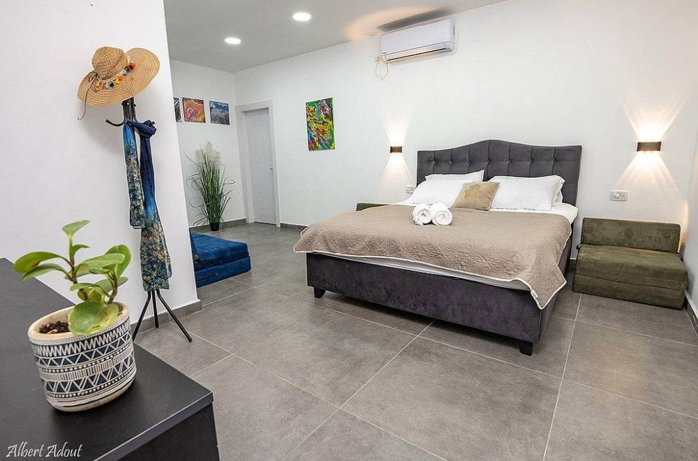 מיטה זוגית, מיזוג אוויר, שידות, פינת ישיבה ומסך צפייה