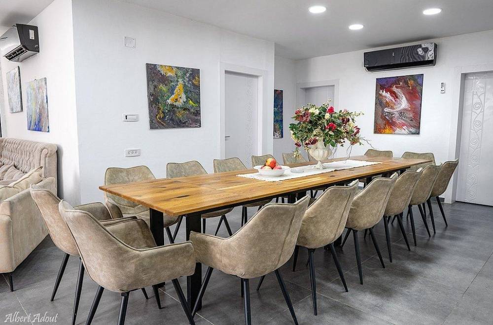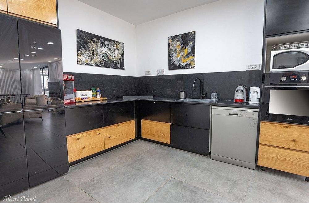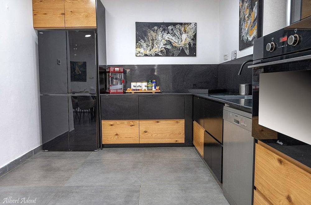 מטבח מאובזר קומפלט הכולל מקרר, תנור אפייה, מדיח כלים, כיריים חשמליות, מכונת אספרסו, קומקום חשמלי, מיקרוגל, כלי אוכל והגשה