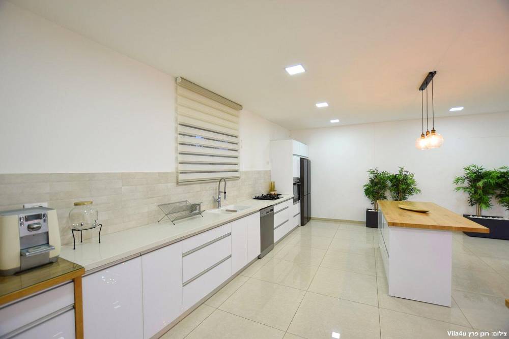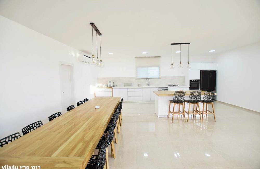 מטבח מאובזר בסכו"ם וכלי הגשה, אי, מדיח כלים, מקרר גדול, מיקרוגל, תנור אפייה, כיריים גז