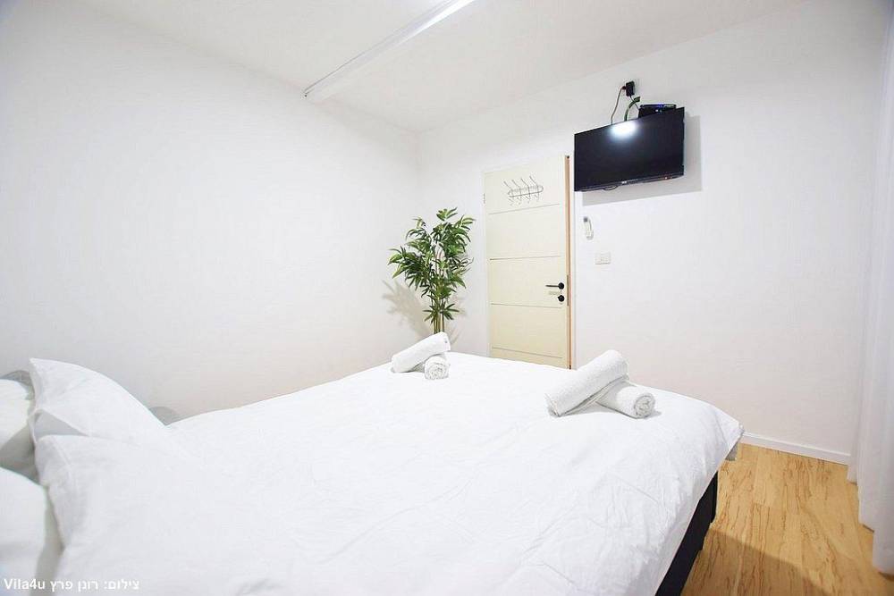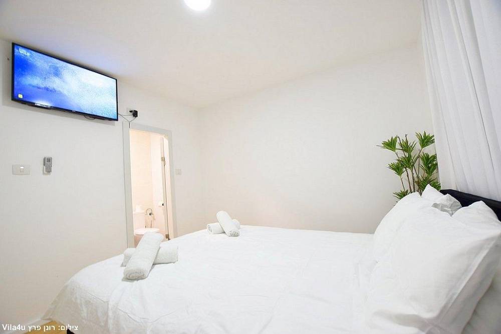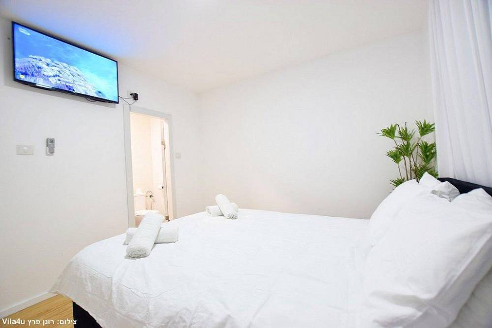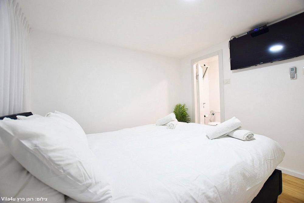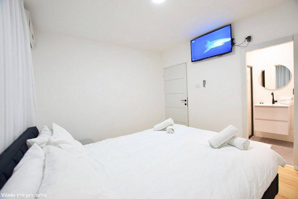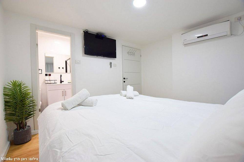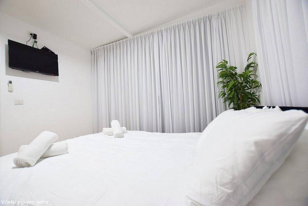 כל חדר לינה כולל מיטה זוגית, שידות אחסון, מזגן ומסך שטוח עם חיבור לערוצי YES
