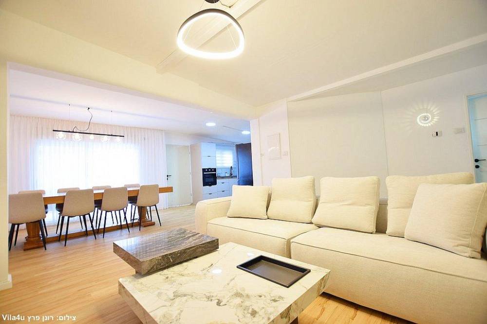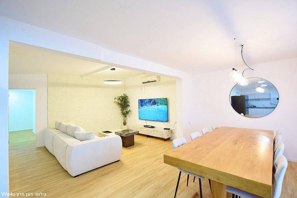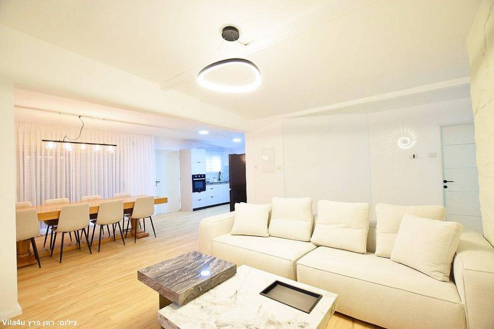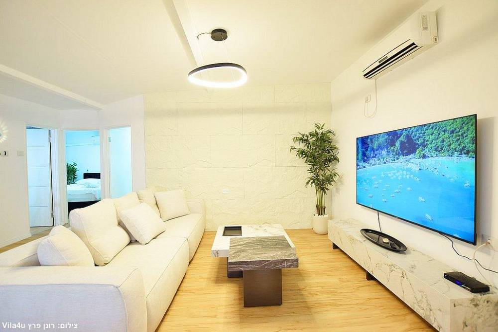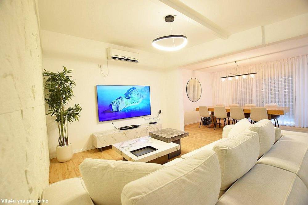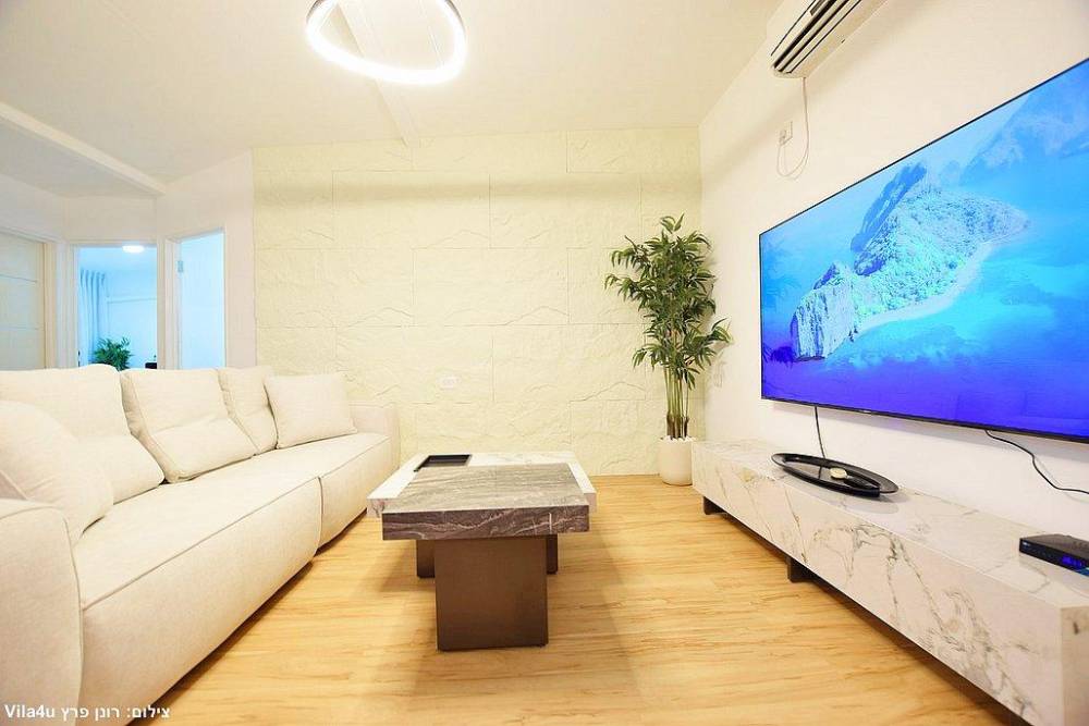 סלון רחב ידיים עם ספות נינוחות, טלוויזיה LCD עם חבילת ערוצי YES ומיזוג אוויר