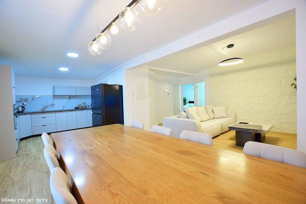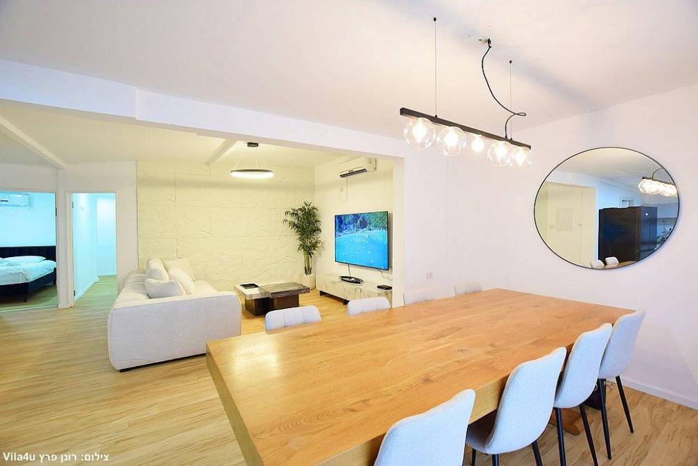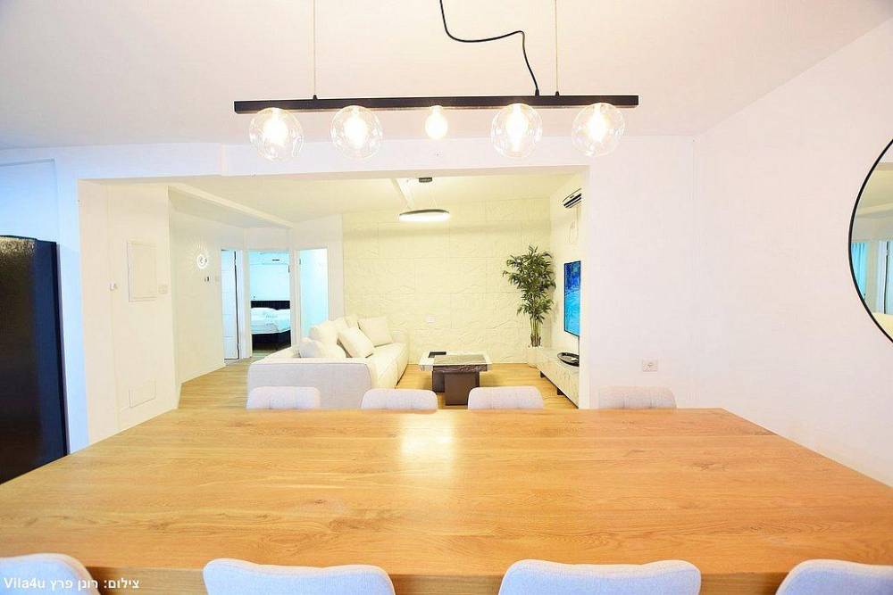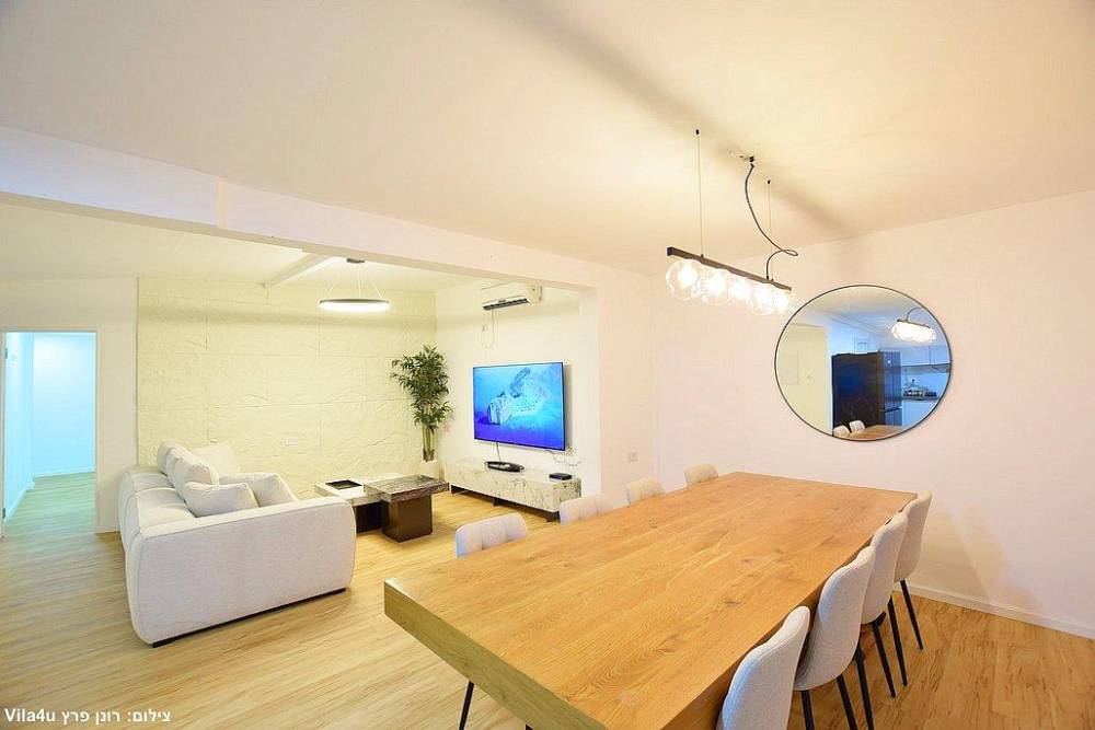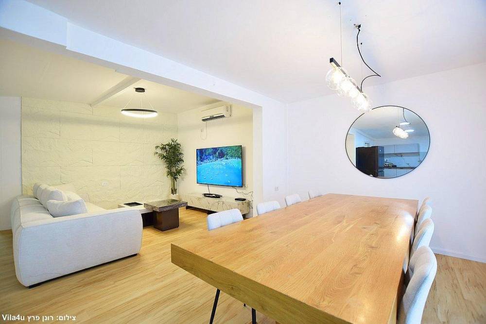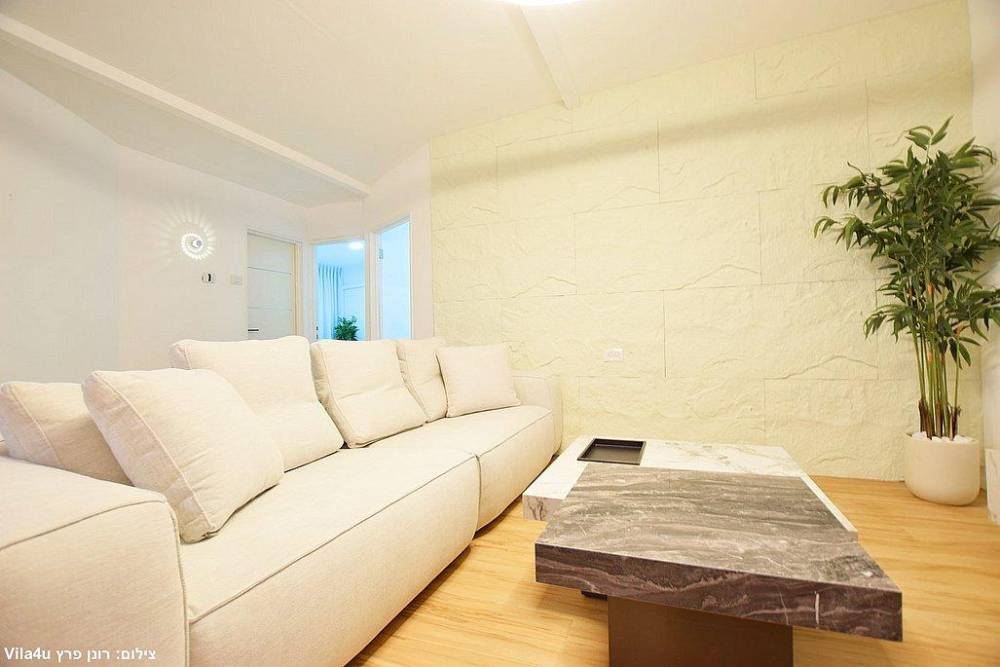 סלון רחב ידיים עם ספות נינוחות, טלוויזיה LCD עם חבילת ערוצי YES ומיזוג אוויר