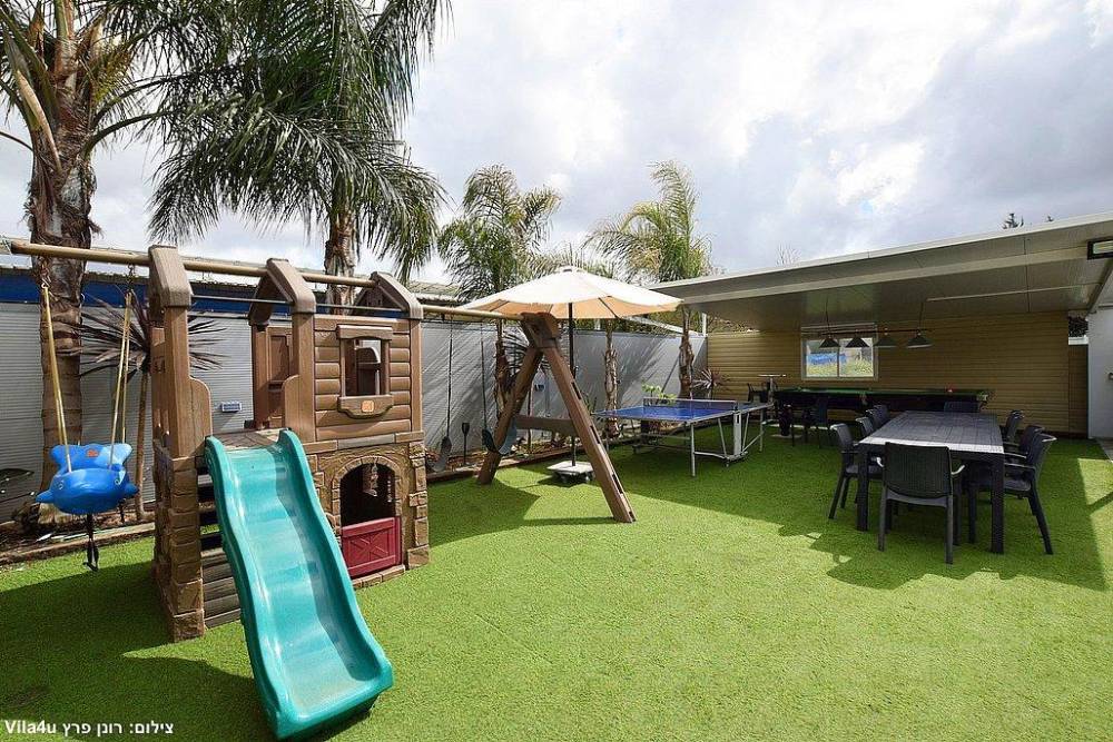 חצר גדולה משתרעת על חצי דונם שכולו פינוק, מדשאה רחבה וגדר תוחמת את המתחם